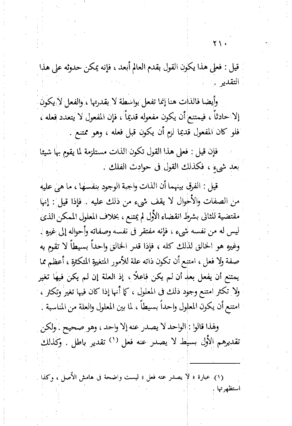 وأيضا فالذات هنا إنما تفعل بواسطة لا بقدرتها والفعل لا يكون إلا حادثا فيمتنع أن يكون مفعوله قديما فإن المفعول لا يتعدد فعله فلو كان المفعول قديما لزم أن يكون قبل فعله وهو ممتنع.