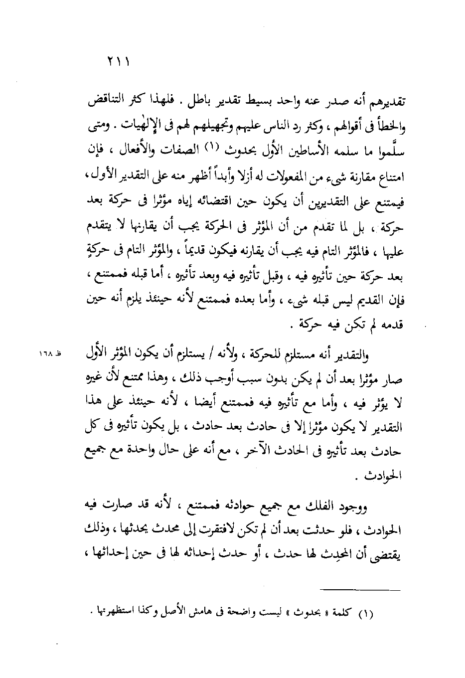 والتقدير أنه مستلزم للحركة ولأنه يستلزم أن يكون المؤثر الأول صار مؤثرا بعد أن لم يكن بدون سبب أوجب ذلك وهذا ممتنع لأن غيره لا يؤثر فيه وأما مع تأثيره فيه فممتنع أيضا لأنه حينئذ على هذا التقدير لا يكون مؤثرا إلا في حادث بعد حادث بل يكون تأثيره في كل حادث بعد تأثيره في الحادث الآخر مع أنه على حال واحدة مع جميع الحوادث.