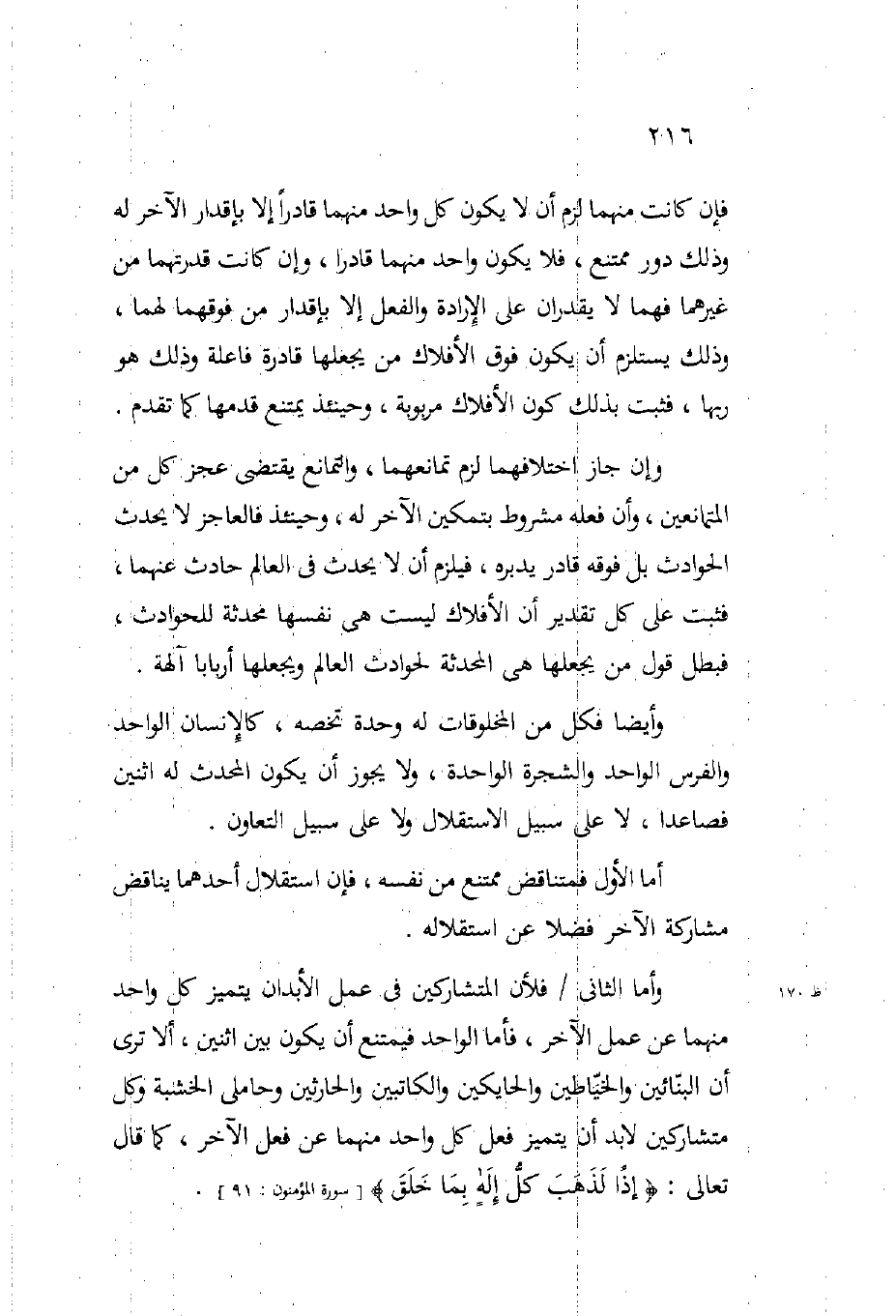 وإن جاز اختلافهما لزم تمانعهما والتمانع يقتضي عجز كل من المتمانعين وأن فعله مشروط بتمكين الآخر له وحينئذ فالعاجز لا يحدث الحوادث بل فوقه قادر يدبره فيلزم أن لا يحدث في العالم حادث عنهما فثبت على كل تقدير أن الأفلاك ليست هي نفسها محدثة للحوادث فبطل قول من يجعلها هي المحدثة لحوادث العالم ويجعلها أربابا آلهة.