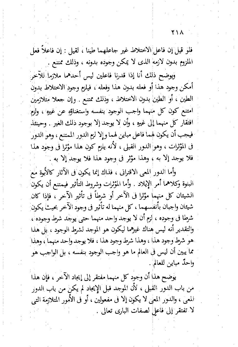 ويوضح ذلك أنا إذا قدرنا فاعلين ليس أحدهما ملازما للآخر أمكن وجود هذا أو فعله بدون هذا وفعله فيلزم وجود الاختلاط بدون الطين أو الطين بدون الاختلاط وذلك ممتنع وإن جعلا متلازمين امتنع كون كل منهما واجب الوجود بنفسه واستغناؤه عن غيره ولزم افتقار كل منهما إلى غيره وأن لا يوجد إلا بوجود ذلك الغير وحينئذ فيجب أن يكون لهما فاعل مباين لهما وإلا لزم الدور الممتنع وهو الدور في المؤثرات وهو الدور القبلي لأنه يلزم كون هذا مؤثرا في وجود هذا فلا يوجد إلا به وهذا مؤثر في وجود هذا فلا يوجد إلا به.