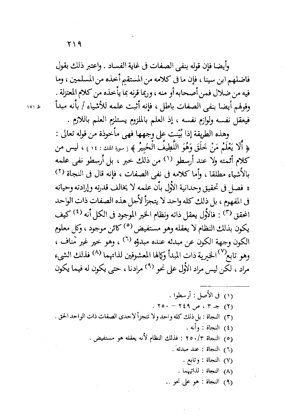 وهذه الطريقة إذا بينت على وجهها فهي مأخوذة من قوله تعالى: {أَلا يَعْلَمُ مَنْ خَلَقَ وَهُوَ اللَّطِيفُ الْخَبِيرُ} (سورة الملك 14) ليس من كلام أئمته ولا عند أرسطو من ذلك خبر بل أرسطو نفي علمه بالأشياء مطلقا وأما كلامه في نفي الصفات فإنه قال في النجاة: "فصل في تحقيق وحدانية الأول بأن علمه لا يخالف قدرته وإرادته وحياته في المفهوم بل ذلك كله واحد لا يتجزأ لأجل هذه الصفات ذات الواحد المحقق فالأول يعقل ذاته ونظام الخير الموجود في الكل أنه كيف يكون بذلك النظام لا يعقله وهو مستفيض كائن موجود وكل معلوم الكون وجهة الكون عن مبدئه عنده مبدؤه وهو خير غير مناف وهو تابع الخيرية ذات المبدأ وكمالها المعشوقين لذاتهما فذلك الشيء مراد لكن ليس مراد الأول على نحو مرادنا حتى يكون له فيما يكون