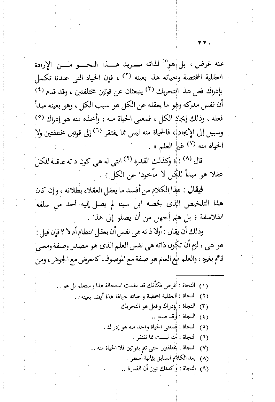 عنه غرض بل هو لذاته مريد هذا النحو من الإرادة العقلية المختصة وحياته هذا بعينه فإن الحياة التي عندنا تكمل بإدراك فعل هذا التحريك ينبعثان عن قوتين مختلفتين وقد قدم أن نفس مدركه وهو ما يعقله عن الكل هو سبب الكل وهو بعينه مبدأ فعله وذلك إيجاد الكل فمعنى الحياة منه وأخذه منه هو إدراك وسبيل إلى الإيجاد فالحياة منه ليس مما يفتقر إلى قوتين مختلفتين ولا الحياة منه غير العلم".