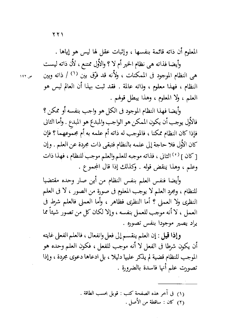 وإذا قيل: إن العلم ينقسم إلى فعل وانفعال فالعلم الفعلي غايته أن يكون شرطا في الفعل لا أنه موجب للفعل فكون العلم وحده هو الموجب للنظام قضية لم يذكر عليها دليلا بل ادعاها دعوى مجردة وإذا تصورت علم أنها فاسدة بالضرورة.