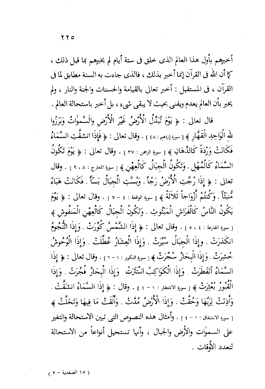 قال تعالى: {يَوْمَ تُبَدَّلُ الأَرْضُ غَيْرَ الأَرْضِ وَالسَّمَاوَاتُ وَبَرَزُوا لِلَّهِ الْوَاحِدِ الْقَهَّارِ} (سورة إبراهيم 48) وقال تعالى: {فَإِذَا انْشَقَّتِ السَّمَاءُ فَكَانَتْ وَرْدَةً كَالدِّهَانِ} (سورة الرحمن 37) وقال تعالى: {يَوْمَ تَكُونُ السَّمَاءُ كَالْمُهْلِ وَتَكُونُ الْجِبَالُ كَالْعِهْنِ} (سورة المعارج 8: 9) وقال تعالى: {إِذَا رُجَّتِ الأَرْضُ رَجّاً وَبُسَّتِ الْجِبَالُ بَسّاً فَكَانَتْ هَبَاءً مُنْبَثّاً وَكُنْتُمْ أَزْوَاجاً ثَلاثَةً} (سورة الواقعة 4-7) وقال تعالى: {يَوْمَ يَكُونُ النَّاسُ كَالْفَرَاشِ الْمَبْثُوثِ وَتَكُونُ الْجِبَالُ كَالْعِهْنِ الْمَنْفُوشِ} (سورة القارعة 4 5) وقال تعالى: {ذَا الشَّمْسُ كُوِّرَتْ وَإِذَا النُّجُومُ انْكَدَرَتْ وَإِذَا الْجِبَالُ سُيِّرَتْ وَإِذَا الْعِشَارُ عُطِّلَتْ وَإِذَا الْوُحُوشُ حُشِرَتْ وَإِذَا الْبِحَارُ سُجِّرَتْ} (سورة التكوير 1 6) وقال تعالى: {إِذَا السَّمَاءُ انْفَطَرَتْ وَإِذَا الْكَوَاكِبُ انْتَثَرَتْ وَإِذَا الْبِحَارُ فُجِّرَتْ وَإِذَا الْقُبُورُ بُعْثِرَتْ} (سورة الانفطار 1 4) وقال: {إِذَا السَّمَاءُ انْشَقَّتْ وَأَذِنَتْ لِرَبِّهَا وَحُقَّتْ وَإِذَا الأَرْضُ مُدَّتْ وَأَلْقَتْ مَا فِيهَا وَتَخَلَّتْ} (سورة الانشقاق 1 4) وأمثال هذه النصوص التي تبين الاستحالة والتغير على السموات والأرض والجبال وأنها تستحيل أنواعا من الاستحالة لتعدد الأوقات.