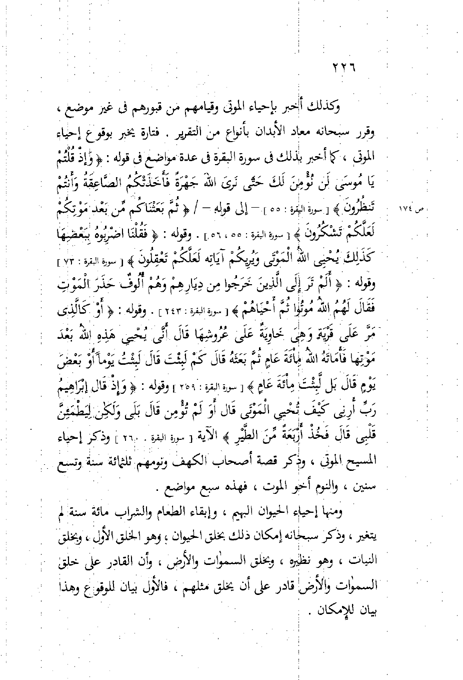 وكذلك أخبر بإحياء الموتى وقيامهم من قبورهم في غير موضع وقرر سبحانه معاد الأبدان بأنواع من التقرير فتارة يخبر بوقوع إحياء الموتى كما أخبر بذلك في سورة البقرة في عدة مواضع في قوله: {وَإِذْ قُلْتُمْ يَا مُوسَى لَنْ نُؤْمِنَ لَكَ حَتَّى نَرَى اللَّهَ جَهْرَةً فَأَخَذَتْكُمُ الصَّاعِقَةُ وَأَنْتُمْ تَنْظُرُونَ} (سورة البقرة 55) إلى قوله: {ثُمَّ بَعَثْنَاكُمْ مِنْ بَعْدِ مَوْتِكُمْ لَعَلَّكُمْ تَشْكُرُونَ} (سورة البقرة 55-56) وقوله: {فَقُلْنَا اضْرِبُوهُ بِبَعْضِهَا كَذَلِكَ يُحْيِي اللَّهُ الْمَوْتَى وَيُرِيكُمْ آيَاتِهِ لَعَلَّكُمْ تَعْقِلُونَ} (سورة البقرة 73) وقوله: {أَلَمْ تَرَ إِلَى الَّذِينَ خَرَجُوا مِنْ دِيَارِهِمْ وَهُمْ أُلُوفٌ حَذَرَ الْمَوْتِ فَقَالَ لَهُمُ اللَّهُ مُوتُوا ثُمَّ أَحْيَاهُمْ} (سورة البقرة 243) وقوله: {أَوْ كَالَّذِي مَرَّ عَلَى قَرْيَةٍ وَهِيَ خَاوِيَةٌ عَلَى عُرُوشِهَا قَالَ أَنَّى يُحْيِي هَذِهِ اللَّهُ بَعْدَ مَوْتِهَا فَأَمَاتَهُ اللَّهُ مِائَةَ عَامٍ ثُمَّ بَعَثَهُ قَالَ كَمْ لَبِثْتَ قَالَ لَبِثْتُ يَوْماً أَوْ بَعْضَ يَوْمٍ قَالَ بَلْ لَبِثْتَ مِائَةَ عَامٍ} (سورة البقرة 259) وقوله: {وَإِذْ قَالَ إِبْرَاهِيمُ رَبِّ أَرِنِي كَيْفَ تُحْيِي الْمَوْتَى قَالَ أَوَلَمْ تُؤْمِنْ قَالَ بَلَى وَلَكِنْ لِيَطْمَئِنَّ قَلْبِي قَالَ فَخُذْ أَرْبَعَةً مِنَ الطَّيْرِ} الآية (سورة البقرة 260) وذكر إحياء المسيح الموتى وذكر قصة أصحاب الكهف ونومهم ثلثمائة سنة وتسع سنين والنوم أخو الموت فهذه سبع مواضع.