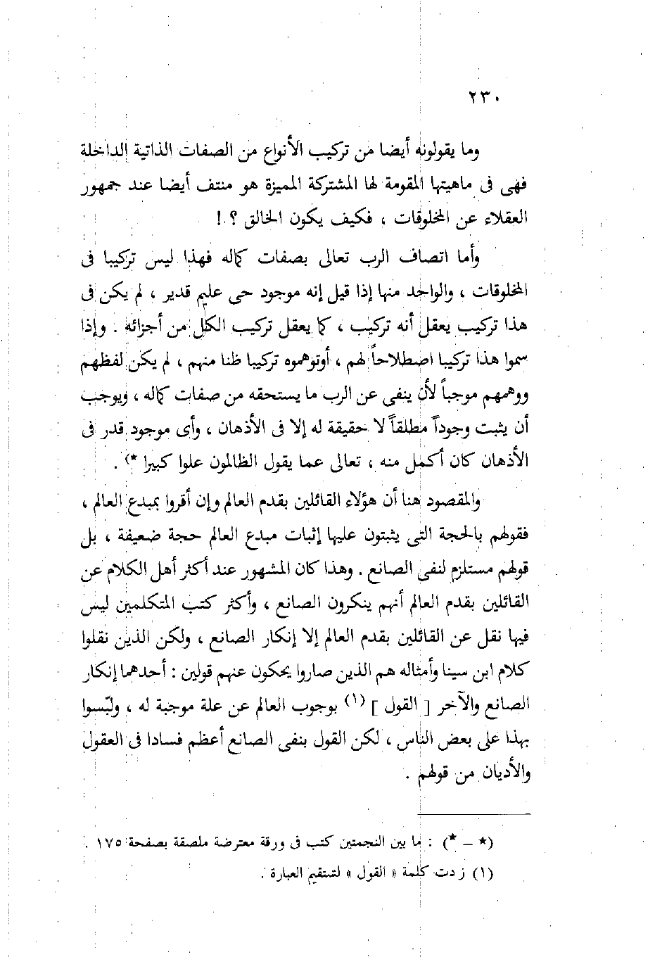 والمقصود هنا أن هؤلاء القائلين بقدم العالم وإن أقروا بمبدع العالم فقولهم بالحجة التي يثبتون عليها إثبات مبدع العالم حجة ضعيفة بل قولهم مستلزم لنفي الصانع وهذا كان المشهور عند أكثر أهل الكلام عن القائلين بقدم العالم أنهم ينكرون الصانع وأكثر كتب المتكلمين ليس فيها نقل عن القائلين بقدم العالم إلا إنكار الصانع ولكن الذين نقلوا كلام ابن سينا وأمثاله هم الذين صاروا يحكون عنهم قولين أحدهما إنكار الصانع والآخر القول بوجوب العالم عن علة موجبة له ولبسوا بهذا على بعض الناس لكن القول بنفي الصانع أعظم فسادا في العقول والأديان من قولهم.