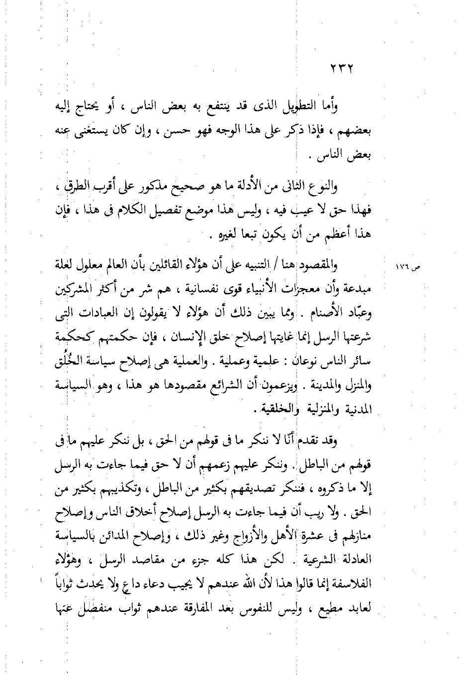 والمقصود هنا التنبيه على أن هؤلاء القائلين بأن العالم معلول لعلة مبدعة وأن معجزات الأنبياء قوى نفسانية هم شر من أكثر المشركين وعباد الأصنام ومما يبين ذلك أن هؤلاء لا يقولون إن العبادات التي شرعتها الرسل إنما غايتها إصلاح خلق الإنسان فإن حكمتهم كحكمة سائر الناس نوعان علمية وعملية والعملية هي إصلاح سياسة الخلق والمنزل والمدينة ويزعمون أن الشرائع مقصودها هو هذا وهو السياسة المدنية والمنزلية والخلقية.