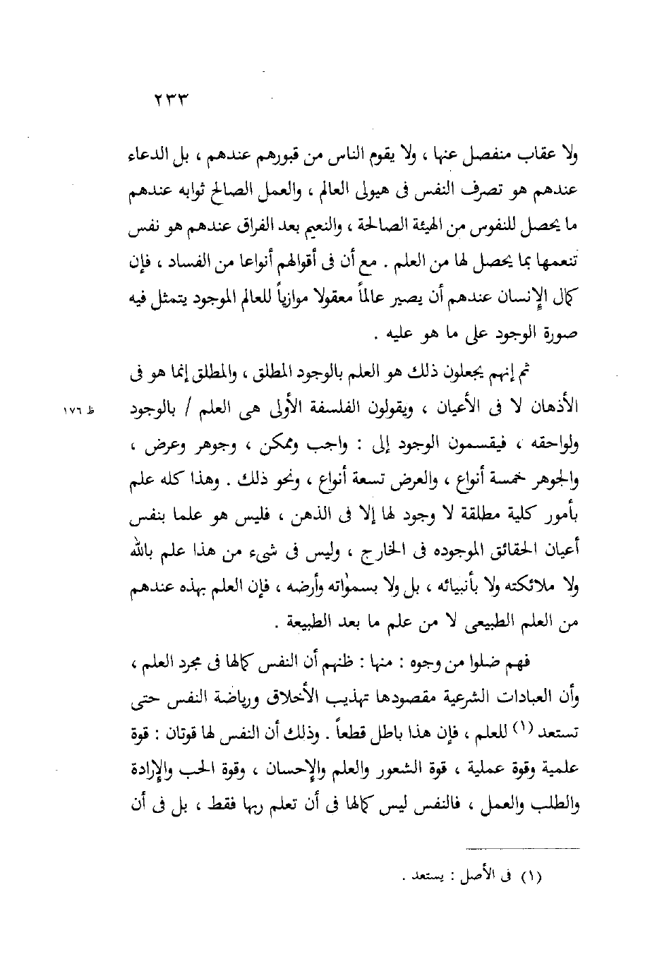 فهم ضلوا من وجوه منها ظنهم أن النفس كمالها في مجرد العلم وأن العبادات الشرعية مقصودها تهذيب الأخلاق ورياضة النفس حتى تستعد للعلم فإن هذا باطل قطعا وذلك أن النفس لها قوتان قوة علمية وقوة عملية قوة الشعور والعلم والإحسان وقوة الحب والإرادة والطلب والعمل فالنفس ليس كمالها في أن تعلم ربها فقط بل في أن