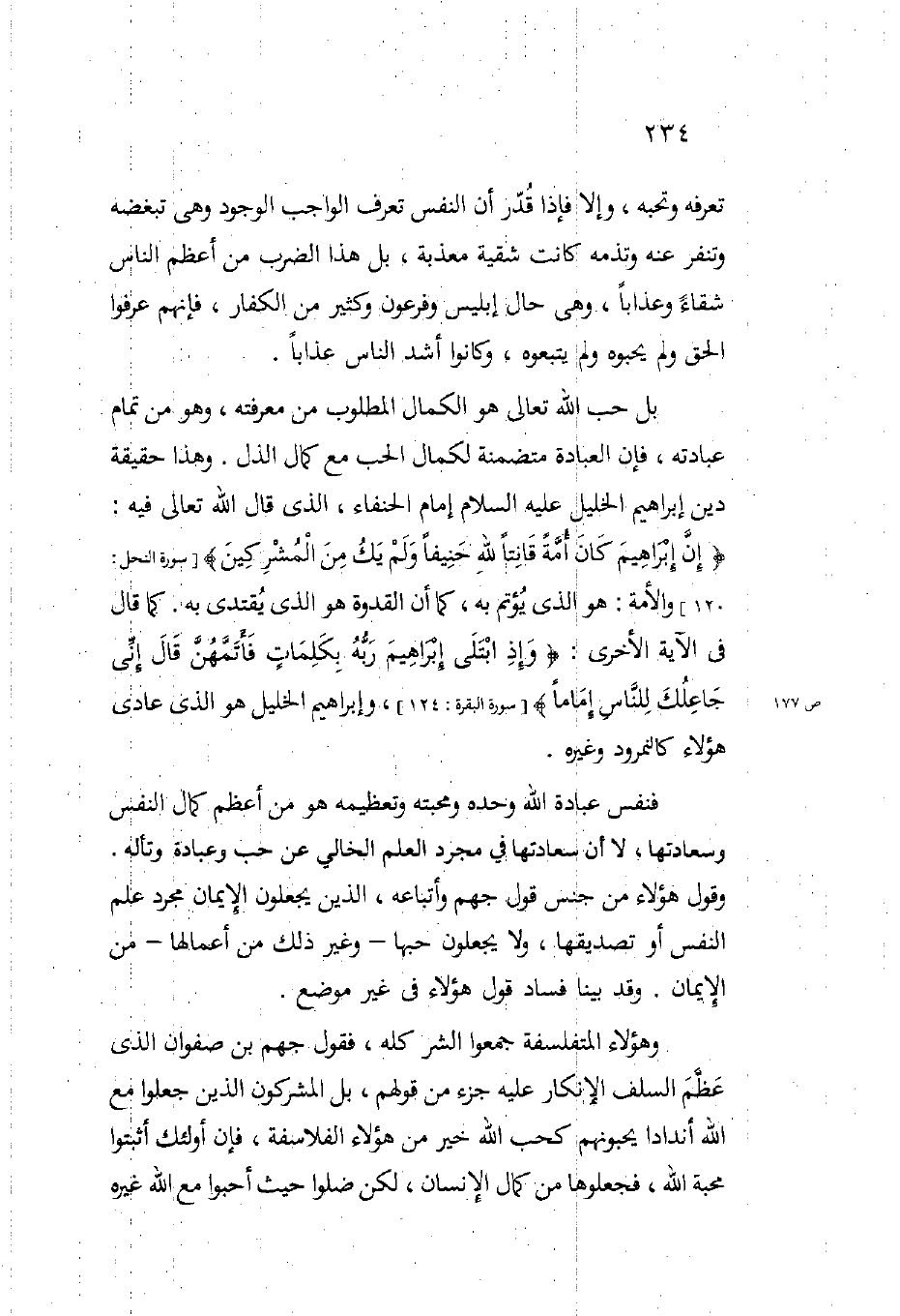 فنفس عبادة الله وحده ومحبته وتعظيمه هو من أعظم كمال النفس وسعادتها لا أن سعادتها في مجرد العلم الخالي عن حب وعبادة وتأله وقول هؤلاء من جنس قول جهم وأتباعه الذين يجعلون الإيمان مجرد علم النفس أو تصديقها ولا يجعلون حبها وغير ذلك من أعمالها من الإيمان وقد بينا فساد قول هؤلاء في غير موضع.