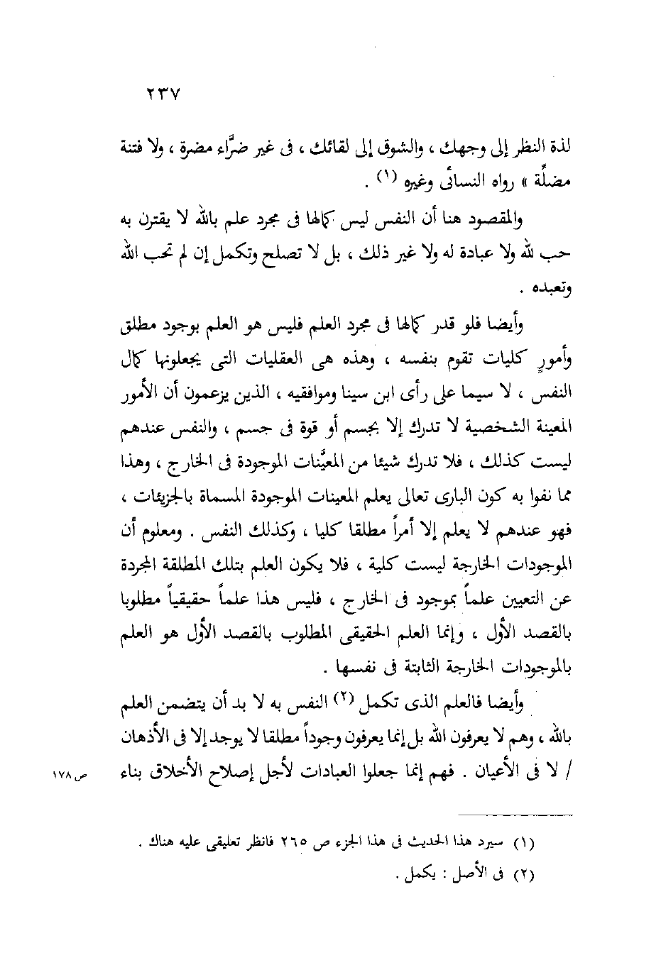 والمقصود هنا أن النفس ليس كمالها في مجرد علم بالله لا يقترن به حب لله ولا عبادة له ولا غير ذلك بل لا تصلح وتكمل إن لم تحب الله وتعبده.