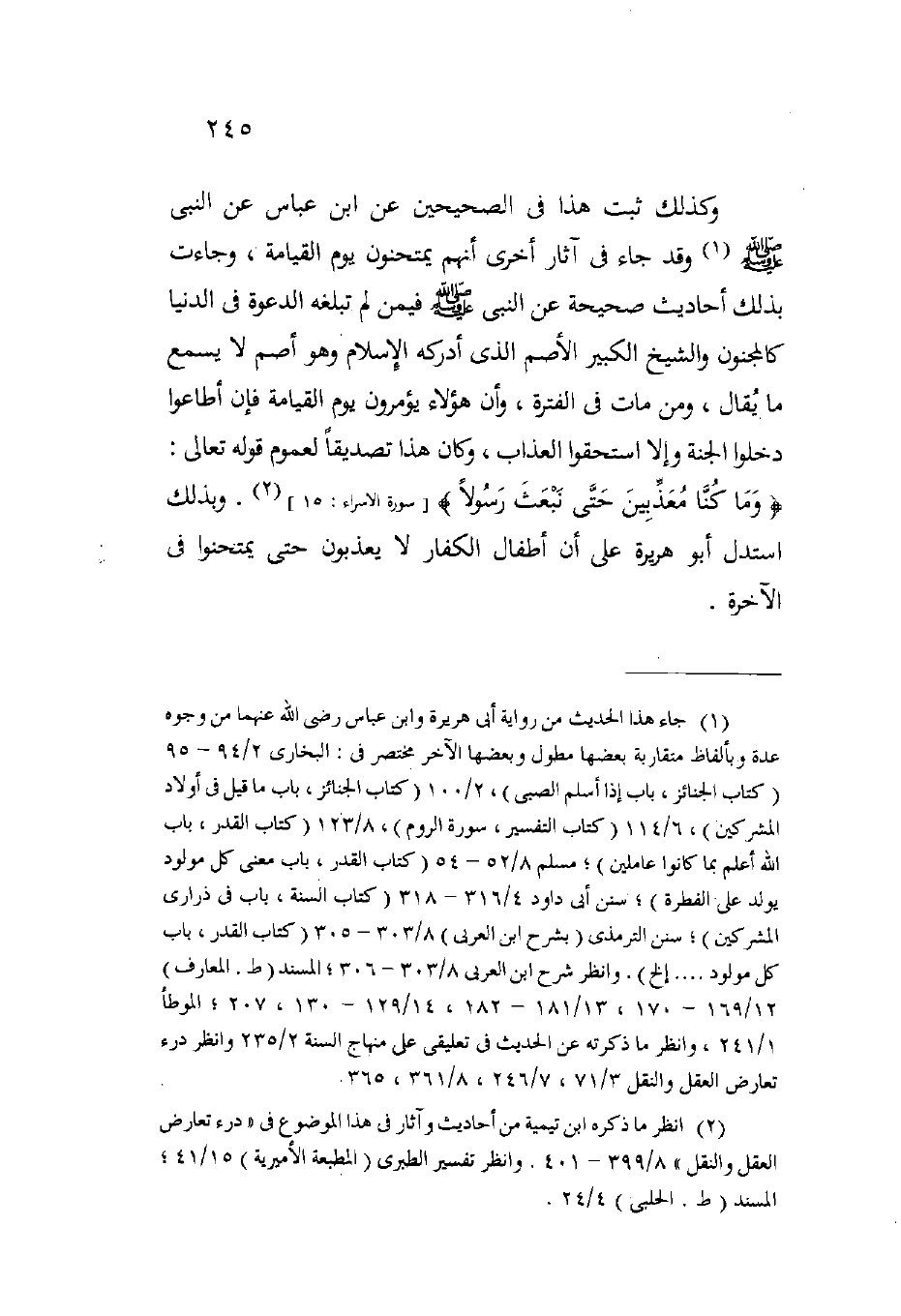 وكذلك ثبت هذا في الصحيحين عن ابن عباس عن النبي صَلَّى اللَّهُ عَلَيْهِ وَسَلَّمَ وقد جاء في آثار أخرى أنهم يمتحنون يوم القيامة وجاءت بذلك أحاديث صحيحة عن النبي صَلَّى اللَّهُ عَلَيْهِ وَسَلَّمَ فيمن لم تبلغه الدعوة في الدنيا كالمجنون والشيخ الكبير الأصم الذي أدركه الإسلام وهو أصم لا يسمع ما يقال ومن مات في الفترة وأن هؤلاء يؤمرون يوم القيامة فإن أطاعوا دخلوا الجنة وإلا استحقوا العذاب وكان هذا تصديقا لعموم قوله تعالى: {وَمَا كُنَّا مُعَذِّبِينَ حَتَّى نَبْعَثَ رَسُولاً} (سورة الإسراء 15) وبذلك استدل أبو هريرة على أن أطفال الكفار لا يعذبون حتى يمتحنوا في الآخرة