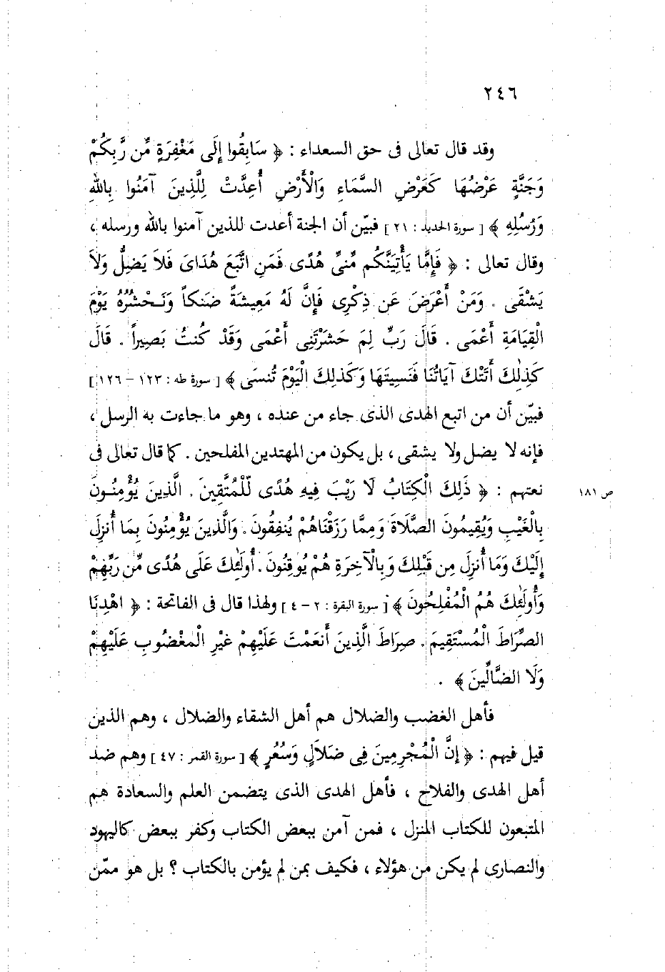 وقد قال تعالى في حق السعداء: {سَابِقُوا إِلَى مَغْفِرَةٍ مِنْ رَبِّكُمْ وَجَنَّةٍ عَرْضُهَا كَعَرْضِ السَّمَاءِ وَالأَرْضِ أُعِدَّتْ لِلَّذِينَ آمَنُوا بِاللَّهِ وَرُسُلِهِ} (سورة الحديد 21) فبين أن الجنة أعدت للذين آمنوا بالله ورسله وقال تعالى: {فَإِمَّا يَأْتِيَنَّكُمْ مِنِّي هُدىً فَمَنِ اتَّبَعَ هُدَايَ فَلا يَضِلُّ وَلا يَشْقَى وَمَنْ أَعْرَضَ عَنْ ذِكْرِي فَإِنَّ لَهُ مَعِيشَةً ضَنْكاً وَنَحْشُرُهُ يَوْمَ الْقِيَامَةِ أَعْمَى قَالَ رَبِّ لِمَ حَشَرْتَنِي أَعْمَى وَقَدْ كُنْتُ بَصِيراً قَالَ كَذَلِكَ أَتَتْكَ آيَاتُنَا فَنَسِيتَهَا وَكَذَلِكَ الْيَوْمَ تُنْسَى} (سورة طه 123-126) فبين أن من اتبع الهدى الذي جاء من عنده وهو ما جاءت به الرسل فإنه لا يضل ولا يشقى بل يكون من المهتدين المفلحين كما قال تعالى في نعتهم: {ذَلِكَ الْكِتَابُ لا رَيْبَ فِيهِ هُدىً لِلْمُتَّقِينَ الَّذِينَ يُؤْمِنُونَ بِالْغَيْبِ وَيُقِيمُونَ الصَّلاةَ وَمِمَّا رَزَقْنَاهُمْ يُنْفِقُونَ والذين يؤمنون بما أنزل إليك وَالَّذِينَ يُؤْمِنُونَ بِمَا أُنْزِلَ إِلَيْكَ وَمَا أُنْزِلَ مِنْ قَبْلِكَ وَبِالآخِرَةِ هُمْ يُوقِنُونَ أُولَئِكَ عَلَى هُدىً مِنْ رَبِّهِمْ وَأُولَئِكَ هُمُ الْمُفْلِحُونَ} (سورة البقرة 2 4) ولهذا قال في الفاتحة: {اهْدِنَا الصِّرَاطَ الْمُسْتَقِيمَ صِرَاطَ الَّذِينَ أَنْعَمْتَ عَلَيْهِمْ غَيْرِ الْمَغْضُوبِ عَلَيْهِمْ وَلا الضَّالِّينَ} .
