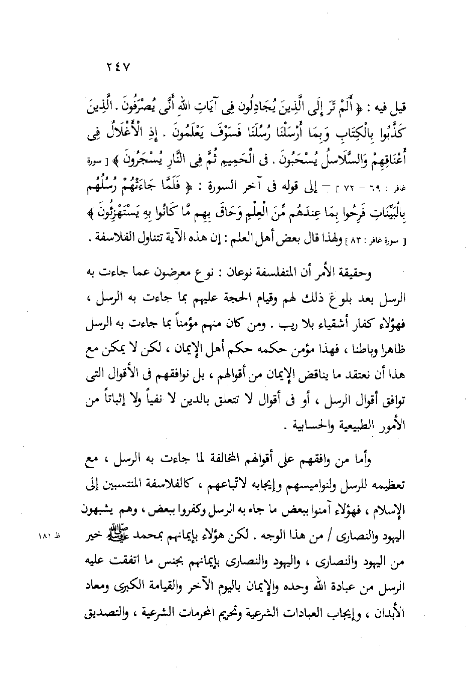 قيل فيه: {أَلَمْ تَرَ إِلَى الَّذِينَ يُجَادِلُونَ فِي آيَاتِ اللَّهِ أَنَّى يُصْرَفُونَ الَّذِينَ كَذَّبُوا بِالْكِتَابِ وَبِمَا أَرْسَلْنَا بِهِ رُسُلَنَا فَسَوْفَ يَعْلَمُونَ إِذِ الأَغْلالُ فِي أَعْنَاقِهِمْ وَالسَّلاسِلُ يُسْحَبُونَ فِي الْحَمِيمِ ثُمَّ فِي النَّارِ يُسْجَرُونَ} (سورة غافر 69 72) إلى قوله في آخر السورة: {فَلَمَّا جَاءَتْهُمْ رُسُلُهُمْ بِالْبَيِّنَاتِ فَرِحُوا بِمَا عِنْدَهُمْ مِنَ الْعِلْمِ وَحَاقَ بِهِمْ مَا كَانُوا بِهِ يَسْتَهْزِئُونَ} (سورة غافر 83) ولهذا قال بعض أهل العلم: "إن هذه الآية تتناول الفلاسفة".