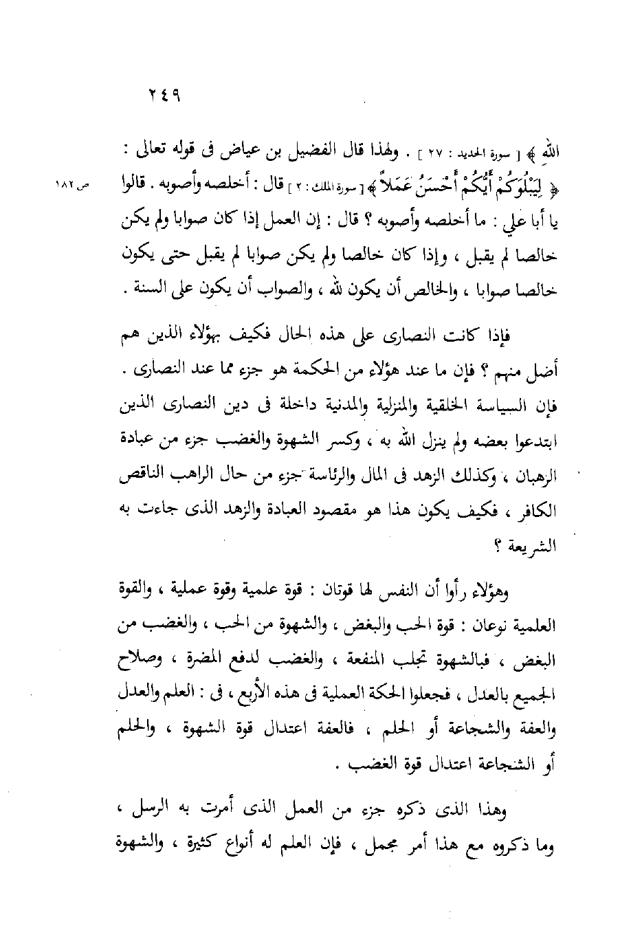 فإذا كانت النصارى على هذه الحال فكيف بهؤلاء الذين هم أضل منهم فإن ما عند هؤلاء من الحكمة هو جزء مما عند النصارى فإن السياسة الخلقية والمنزلية والمدنية داخلة في دين النصارى الذين ابتدعوا بعضه ولم ينزل الله به وكسر الشهوة والغضب جزء من عبادة الرهبان وكذلك الزهد في المال والرئاسة جزء من حال الراهب الناقص الكافر فكيف يكون هذا هو مقصود العبادة والزهد الذي جاءت به الشريعة؟