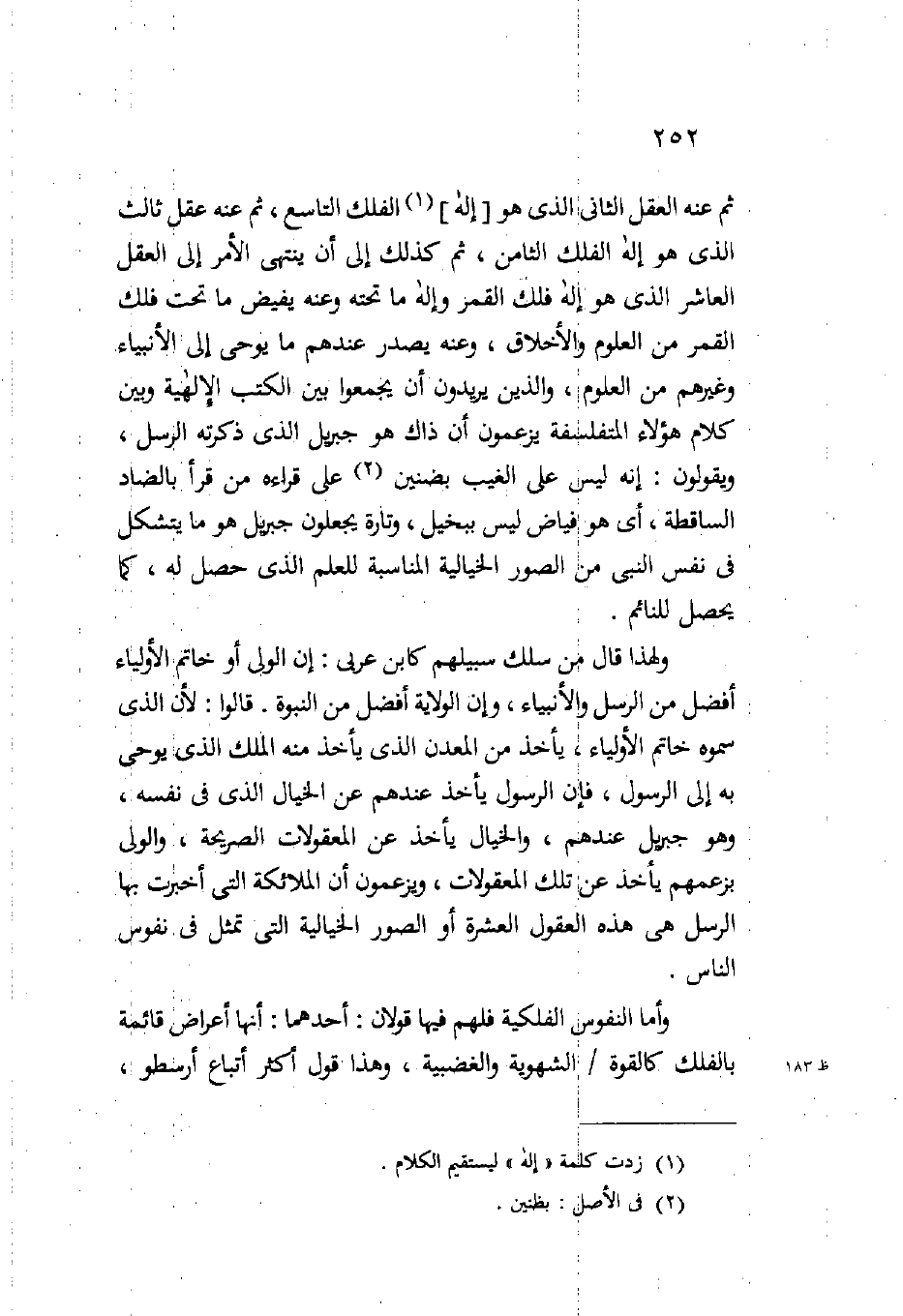 ثم عنه العقل الثاني هو إله الفلك التاسع ثم عنه عقل ثالث الذي هو إله الفلك الثامن ثم كذلك إلى أن ينتهي الأمر إلى العقل العاشر الذي هو إله فلك القمر وإله ما تحته وعنه يفيض ما تحت فلك القمر من العلوم والأخلاق وعنه يصدر عندهم ما يوحى إلى الأنبياء وغيرهم من العلوم والذين يريدون أن يجمعوا بين الكتب الإلهية وبين كلام هؤلاء المتفلسفة يزعمون أن ذاك هو جبريل الذي ذكرته الرسل ويقولون إنه ليس على الغيب بضنين على قراءة من قرأ بالضاد الساقطة أي هو فياض ليس ببخيل وتارة يجعلون جبريل هو ما يتشكل في نفس النبي من الصور الخيالية المناسبة للعلم الذي حصل له كما يحصل للنائم.