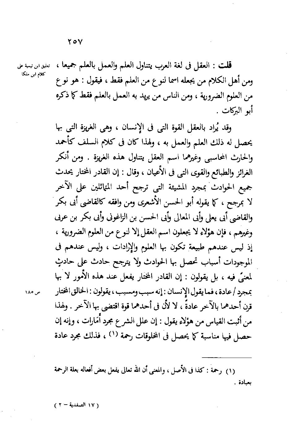 وقد يراد بالعقل القوة التي في الإنسان وهي الغريزة التي بها يحصل له ذلك العلم والعمل به ولهذا كان في كلام السلف كأحمد والحارث المحاسبي وغيرهما اسم العقل يتناول هذه الغريزة ومن أنكر الغرائز والطبائع والقوى التي في الأعيان وقال إن القادر المختار يحدث جميع الحوادث بمجرد المشيئة التي ترجح أحد المتماثلين على الآخر لا بمرجح كما يقوله أبو الحسن الأشعري ومن وافقه كالقاضي أبي بكر والقاضي أبي يعلى وأبي المعالي وأبي الحسن بن الزاغوني وأبي بكر بن عربي وغيرهم فإن هؤلاء لا يجعلون اسم العقل إلا لنوع من العلوم الضرورية إذ ليس عندهم طبيعة تكون بها العلوم والإرادات وليس عندهم في الموجودات أسباب تحصل بها الحوادث ولا يترجح حادث على حادث لمعنى فيه بل يقولون إن القادر المختار يفعل عند هذه الأمور لا بها بمجرد عادة فما يقول الإنسان إنه سبب ومسبب يقولون الخالق المختار قرن أحدهما بالآخر عادة لا لأن في أحدهما قوة اقتضى بها الآخر ولهذا من أثبت القياس من هؤلاء يقول إن علل الشرع مجرد أمارات وإنه إن حصل فيها مناسبة كما يحصل في المخلوقات رحمة فذلك مجرد عادة