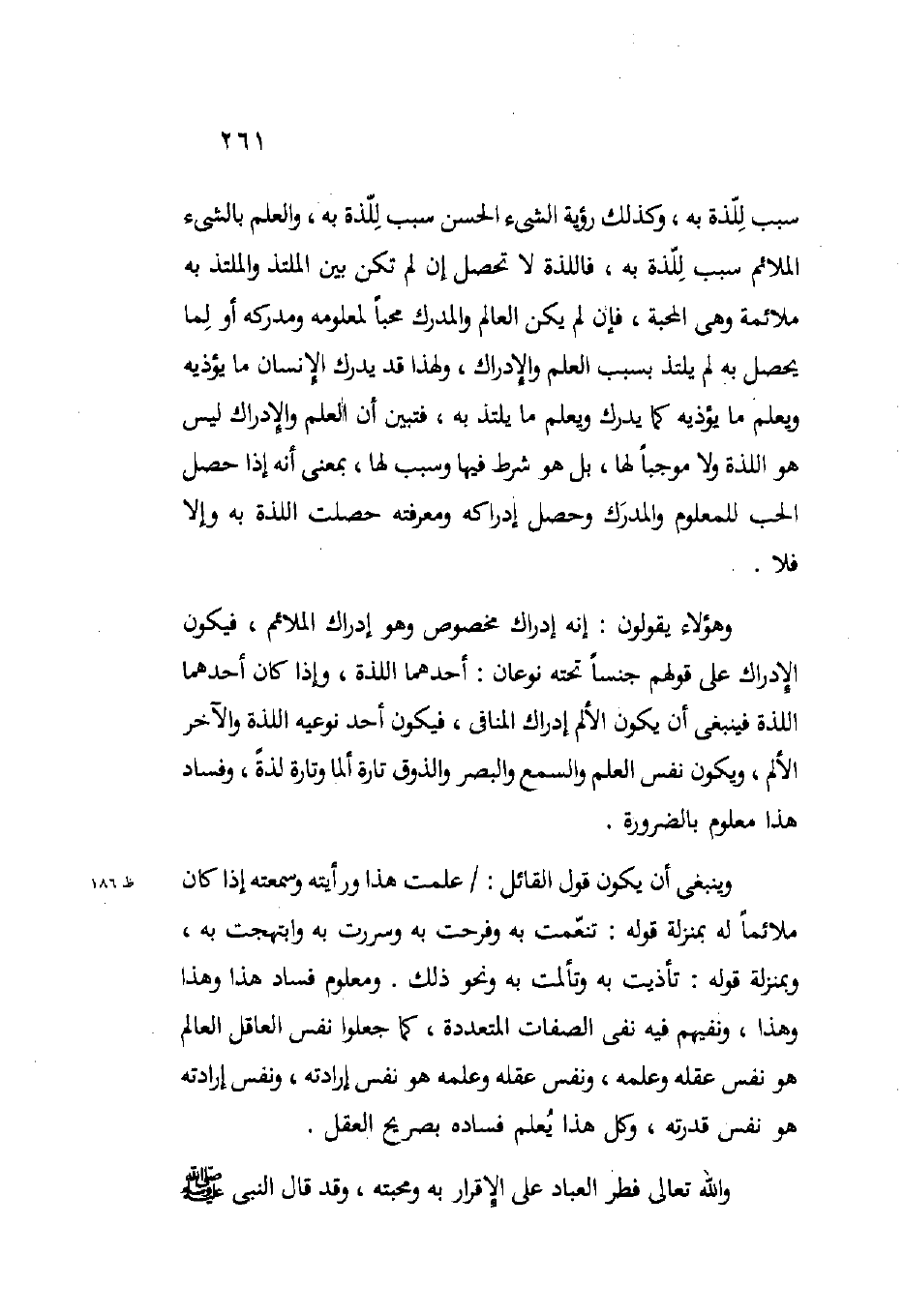 وينبغي أن يكون قول القائل: علمت هذا ورأيته وسمعته إذا كان ملائما له بمنزلة قوله تنعمت به وفرحت به وسررت به وابتهجت به وبمنزلة قوله تأذيت به وتألمت به ونحو ذلك ومعلوم فساد هذا وهذا، وهذا ونفيهم فيه نفي الصفات المتعددة كما جعلوا نفس العاقل العالم هو نفس عقله وعلمه ونفس عقله وعلمه هو نفس إرادته ونفس إرادته هو نفس قدرته وكل هذا يعلم فساده بصريح العقل.