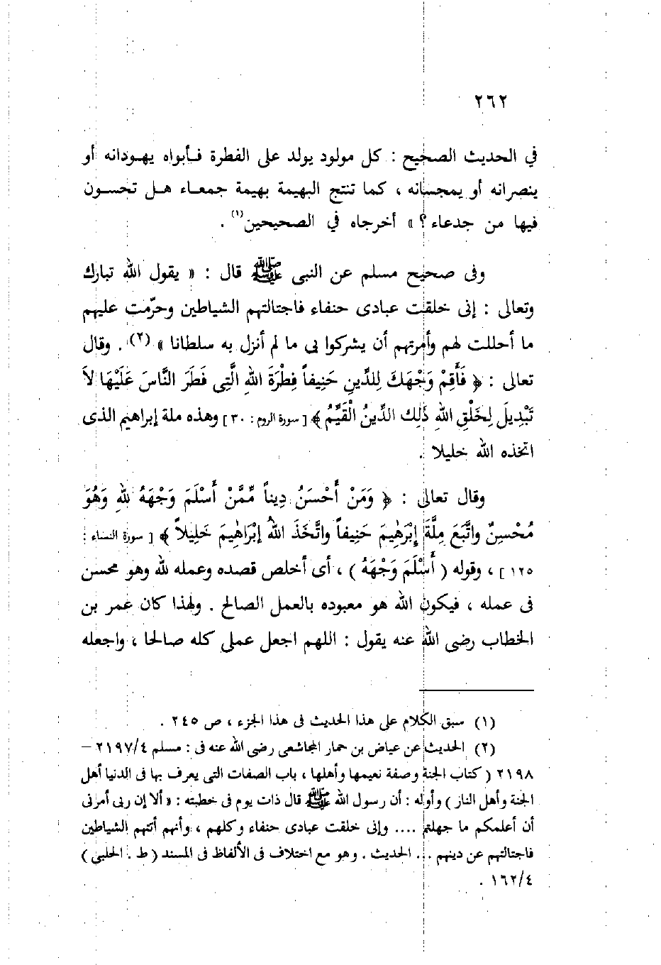 وفي صحيح مسلم عن النبي صَلَّى اللَّهُ عَلَيْهِ وَسَلَّمَ قال: "يقول الله تبارك وتعالى: إني خلقت عبادي حنفاء فاجتالتهم الشياطين وحرمت عليهم ما أحللت لهم وأمرتهم أن يشركوا بي ما لم أنزل به سلطانا" وقال تعالى: {فَأَقِمْ وَجْهَكَ لِلدِّينِ حَنِيفاً فِطْرَتَ اللَّهِ الَّتِي فَطَرَ النَّاسَ عَلَيْهَا لا تَبْدِيلَ لِخَلْقِ اللَّهِ ذَلِكَ الدِّينُ الْقَيِّمُ} (سورة الروم 30) وهذه ملة إبراهيم الذي اتخذه الله خليلا.