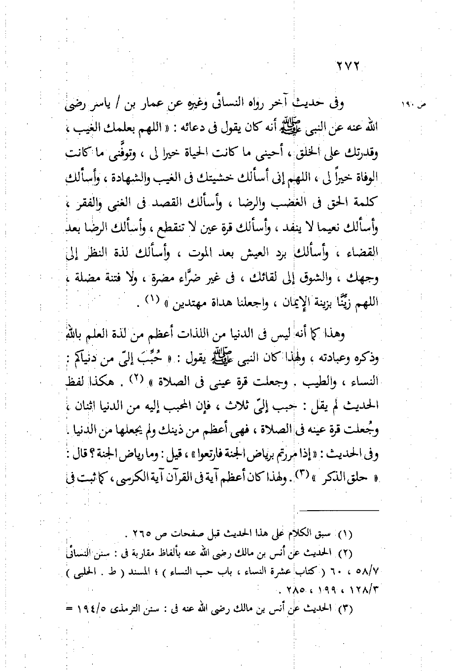 وفي حديث آخر رواه النسائي وغيره عن عمار بن ياسر رضي الله عنه عن النبي صَلَّى اللَّهُ عَلَيْهِ وَسَلَّمَ أنه كان يقول في دعائه: "اللهم بعلمك الغيب وقدرتك على الخلق أحيني ما كانت الحياة خيرا لي وتوفني ما كانت الوفاة خيرا لي اللهم إني أسألك خشيتك في الغيب والشهادة وأسألك كلمة الحق في الغضب والرضا وأسألك القصد في الغنى والفقر وأسألك نعيما لا ينفد وأسألك قرة عين لا تنقطع وأسألك الرضا بعد القضاء وأسألك برد العيش بعد الموت وأسألك لذة النظر إلى وجهك والشوق إلى لقائك في غير ضراء مضرة ولا فتنة مضلة اللهم زينا بزينة الإيمان واجعلنا هداة مهتدين".