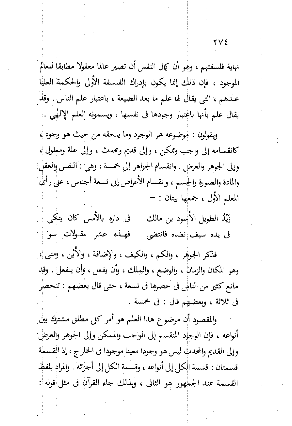 ويقولون: موضوعه هو الوجود وما يلحقه من حيث هو وجود كانقسامه إلى واجب وممكن وإلى قديم ومحدث وإلى علة ومعلول وإلى الجوهر والعرض وانقسام الجواهر إلى خمسة وهي النفس والعقل والمادة والصورة والجسم وانقسام الأعراض إلى تسعة أجناس على رأي المعلم الأول جمعها بيتان: