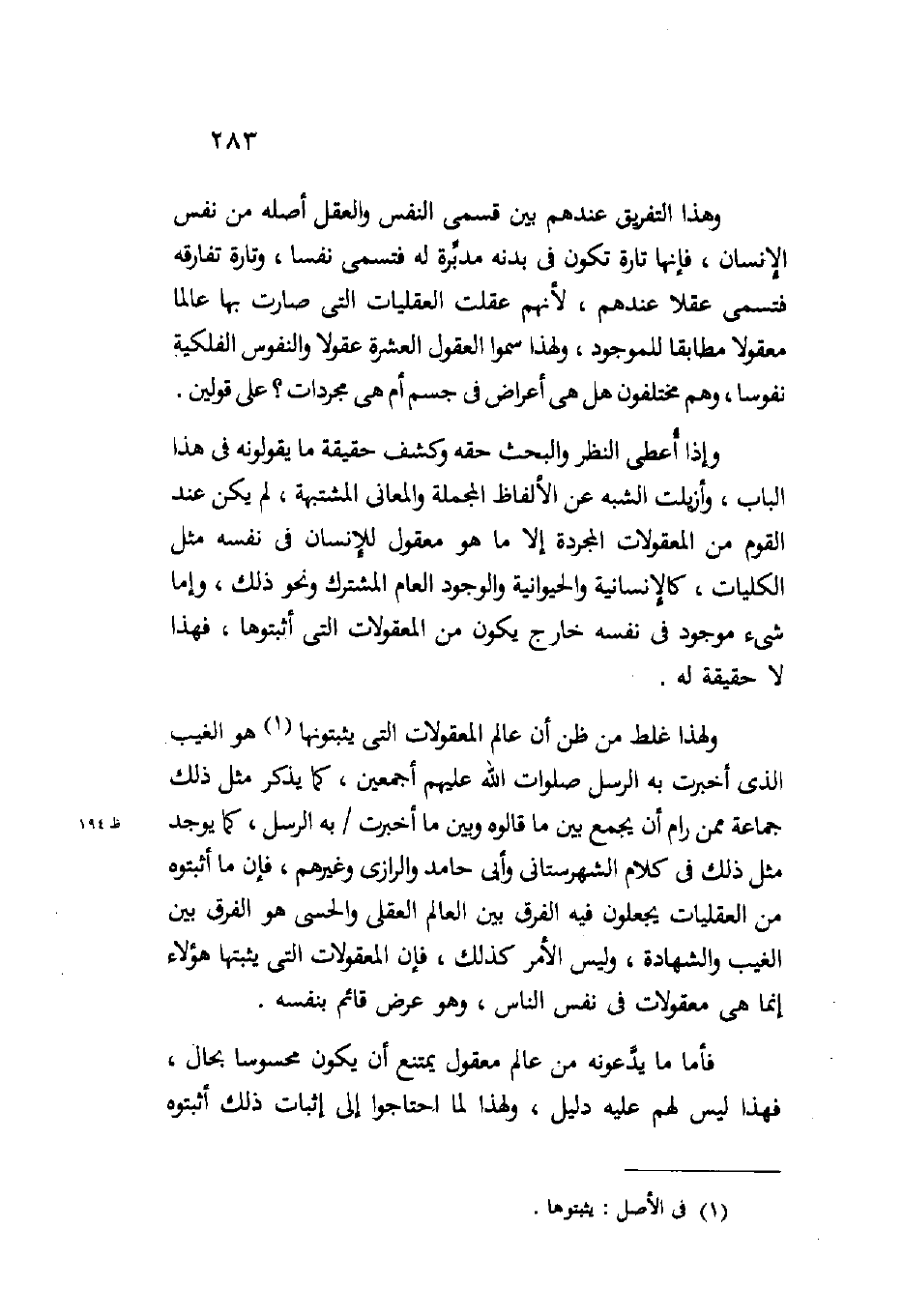 ولهذا غلط من ظن أن عالم المعقولات التي يثبتونها هو الغيب الذي أخبرت به الرسل صلوات الله عليهم أجمعين كما يذكر مثل ذلك جماعة ممن رام أن يجمع بين ما قالوه وبين ما أخبرت به الرسل كما يوجد مثل ذلك في كلام الشهرستاني وأبي حامد والرازي وغيرهم فإن ما أثبتوه من العقليات يجعلون فيه الفرق بين العالم العقلي والحسي هو الفرق بين الغيب والشهادة وليس الأمر كذلك فإن المعقولات التي يثبتها هؤلاء إنما هي معقولات في نفس الناس وهو عرض قائم بنفسه.
