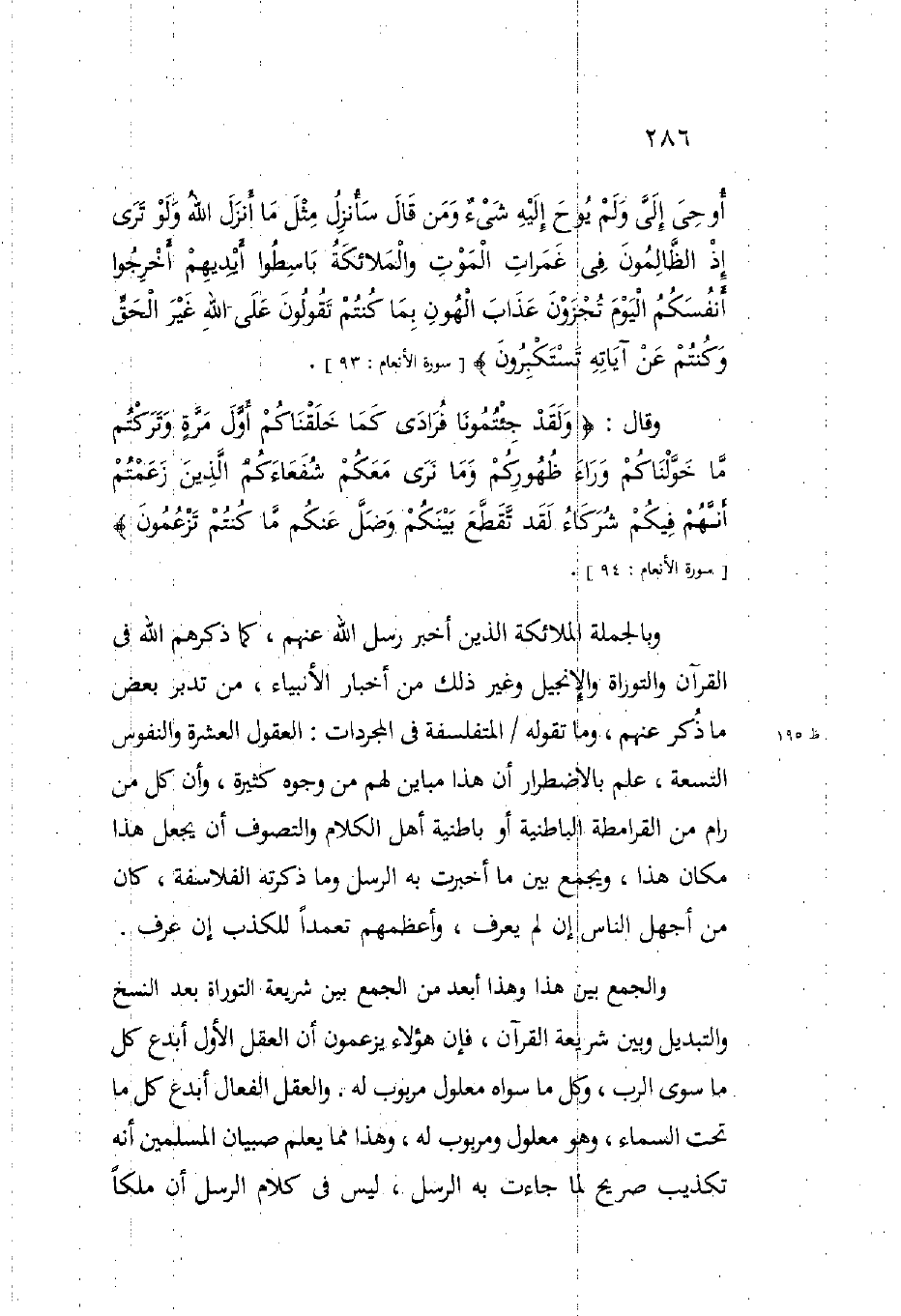أُوحِيَ إِلَيَّ وَلَمْ يُوحَ إِلَيْهِ شَيْءٌ وَمَنْ قَالَ سَأُنْزِلُ مِثْلَ مَا أَنْزَلَ اللَّهُ وَلَوْ تَرَى إِذِ الظَّالِمُونَ فِي غَمَرَاتِ الْمَوْتِ وَالْمَلائِكَةُ بَاسِطُو أَيْدِيهِمْ أَخْرِجُوا أَنْفُسَكُمُ الْيَوْمَ تُجْزَوْنَ عَذَابَ الْهُونِ بِمَا كُنْتُمْ تَقُولُونَ عَلَى اللَّهِ غَيْرَ الْحَقِّ وَكُنْتُمْ عَنْ آيَاتِهِ تَسْتَكْبِرُونَ} (سورة الأنعام 93) وقال: {وَلَقَدْ جِئْتُمُونَا فُرَادَى كَمَا خَلَقْنَاكُمْ أَوَّلَ مَرَّةٍ وَتَرَكْتُمْ مَا خَوَّلْنَاكُمْ وَرَاءَ ظُهُورِكُمْ وَمَا نَرَى مَعَكُمْ شُفَعَاءَكُمُ الَّذِينَ زَعَمْتُمْ أَنَّهُمْ فِيكُمْ شُرَكَاءُ لَقَدْ تَقَطَّعَ بَيْنَكُمْ وَضَلَّ عَنْكُمْ مَا كُنْتُمْ تَزْعُمُونَ} وبالجملة الملائكة الذين أخبر رسل الله عنهم كما ذكرهم الله في القرآن والتوراة والإنجيل وغير ذلك من أخبار الأنبياء من تدبر بعض ما ذكر عنهم وما تقوله المتفلسفة في المجردات العقول العشرة والنفوس التسعة علم بالاضطرار أن هذا مباين لهم من وجوه كثيرة وأن كل من رام من القرامطة الباطنية أو باطنية أهل الكلام والتصوف أن يجعل هذا مكان هذا ويجمع بين ما أخبرت به الرسل وما ذكرته الفلاسفة كان من أجهل الناس إن لم يعرف وأعظمهم تعمدا للكذب إن عرف.