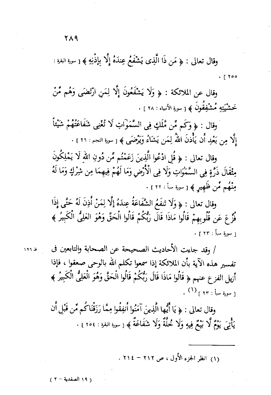 وقال تعالى: {وَلا تَنْفَعُ الشَّفَاعَةُ عِنْدَهُ إِلاَّ لِمَنْ أَذِنَ لَهُ حَتَّى إِذَا فُزِّعَ عَنْ قُلُوبِهِمْ قَالُوا مَاذَا قَالَ رَبُّكُمْ قَالُوا الْحَقَّ وَهُوَ الْعَلِيُّ الْكَبِيرُ} (سورة سبأ 23) .