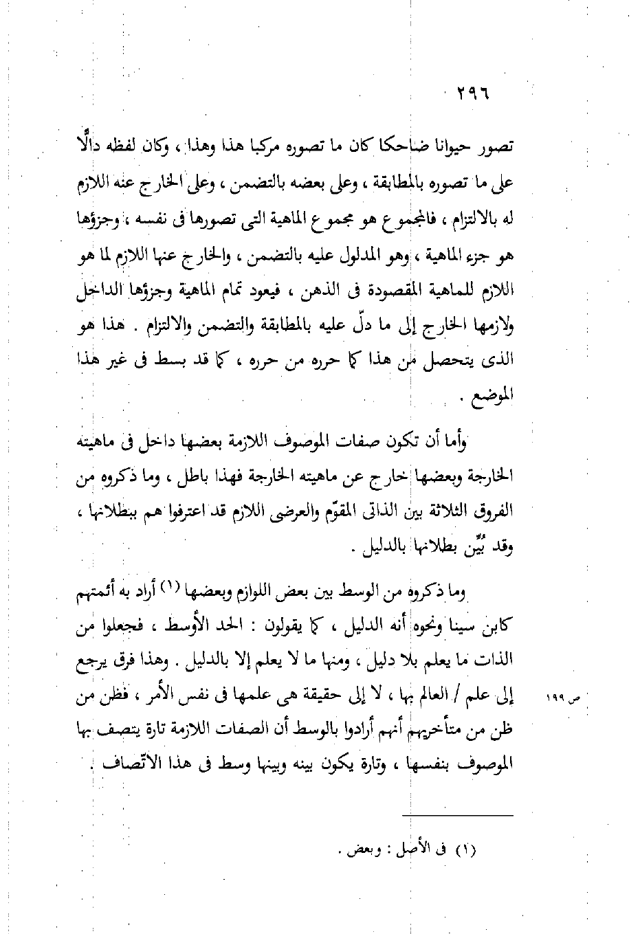 وما ذكروه من الوسط بين بعض اللوازم وبعضها أراد به أئمتهم كابن سينا ونحوه أنه الدليل كما يقولون الحد الأوسط فجعلوا من الذات ما يعلم بلا دليل ومنها ما لا يعلم إلا بالدليل وهذا فرق يرجع إلى علم العالم بها لا إلى حقيقة هي علمها في نفس الأمر فظن من ظن من متأخريهم أنهم أرادوا بالوسط أن الصفات اللازمة تارة يتصف بها الموصوف بنفسها وتارة يكون بينه وبينها وسط في هذا الاتصاف.