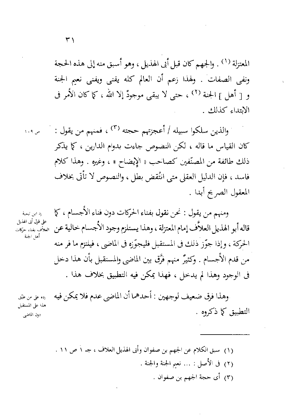 المعتزلة والجهم كان قبل أبي الهذيل وهو أسبق منه إلى هذه الحجة ونفى الصفات ولهذا زعم أن العالم كله يفنى ويفنى نعيم الجنة وأهل الجنة حتى لا يبقى موجود إلا الله كما كان الأمر في الابتداء كذلك.