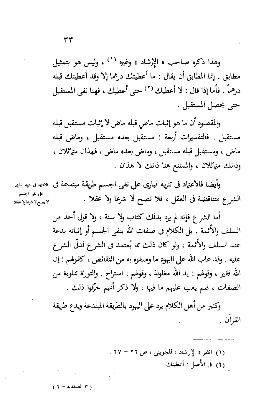 أما الشرع فإنه لم يرد بذلك كتاب ولا سنة ولا قول أحد من السلف والأئمة بل الكلام في صفات الله بنفي الجسم أو إثباته بدعة عند السلف والأئمة ولو كان ذلك مما يعتمد في الشرع لدل الشرع عليه وقد عاب الله على اليهود ما وصفوه به من النقائص كقولهم إن الله فقير وقولهم يد الله مغلولة وقولهم استراح والتوراة مملوءة من الصفات فلم يعب عليهم ما فيها ولا ذكر أنهم حرفوا ذلك.