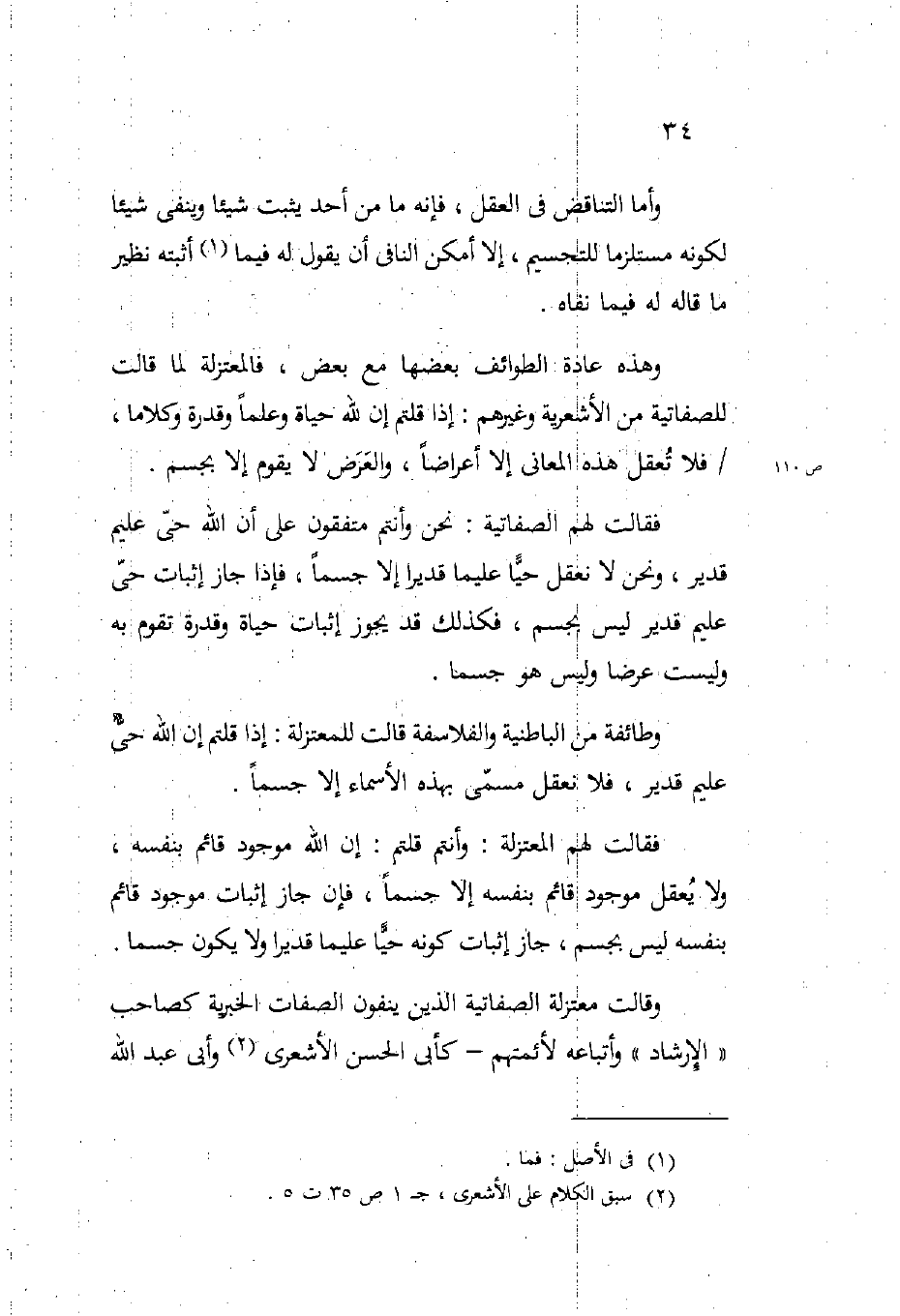 وهذه عادة الطوائف بعضها مع بعض فالمعتزلة لما قالت للصفاتية من الأشعرية وغيرهم إذا قلتم إن لله حياة وعلما وقدرة وكلاما فلا تعقل هذه المعاني إلا أعراضا والعرض لا يقوم إلا بجسم.