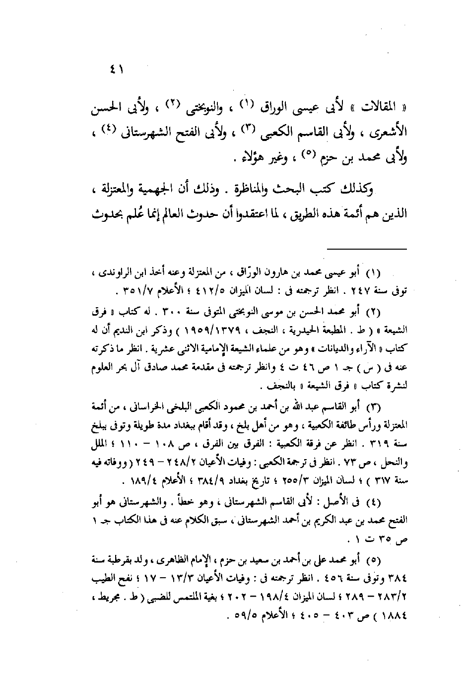 المقالات لأبي عيسى الوراق والنوبختي ولأبي الحسن الأشعري ولأبي القاسم الكعبي ولأبي الفتح الشهرستاني ولأبي محمد بن حزم وغير هؤلاء.