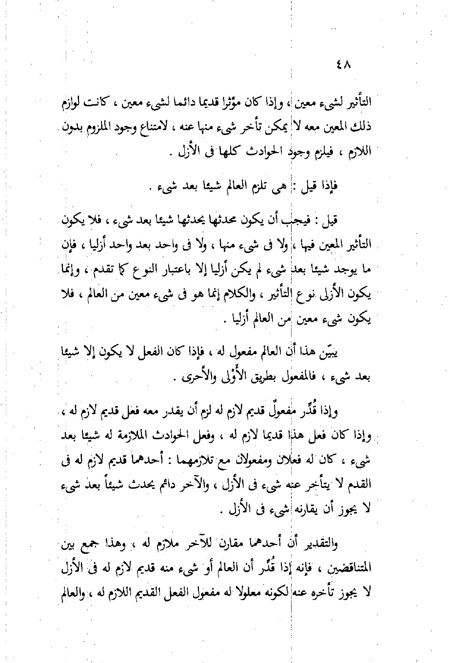 التأثير لشيء معين وإذا كان مؤثرا قديما دائما لشيء معين كانت لوازم ذلك المعين معه لا يمكن تأخر شيء منها عنه لامتناع وجود الملزوم بدون اللازم فيلزم وجود الحوادث كلها في الأزل.