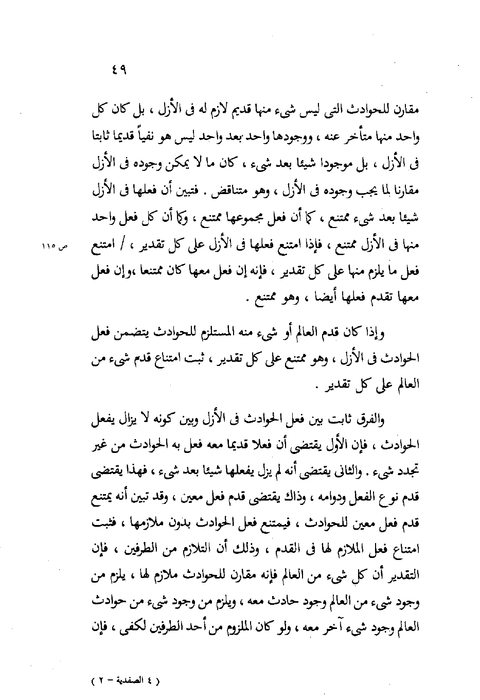 مقارن للحوادث التي ليس شيء منها قديم لازم له في الأزل بل كان كل واحد منها متأخر عنه ووجودها واحد بعد واحد ليس هو نفيا قديما ثابتا في الأزل بل موجودا شيئا بعد شيء كان ما لا يمكن وجوده في الأزل مقارنا لما يجب وجوده في الأزل وهو متناقض فتبين أن فعلها في الأزل شيئا بعد شيء ممتنع كما أن فعل مجموعها ممتنع وكما أن كل فعل واحد منها في الأزل ممتنع فإذا امتنع فعلها في الأزل على كل تقدير امتنع فعل ما يلزم منها على كل تقدير فإنه إن فعل معها كان ممتنعا وإن فعل معها تقدم فعلها أيضا وهو ممتنع.
