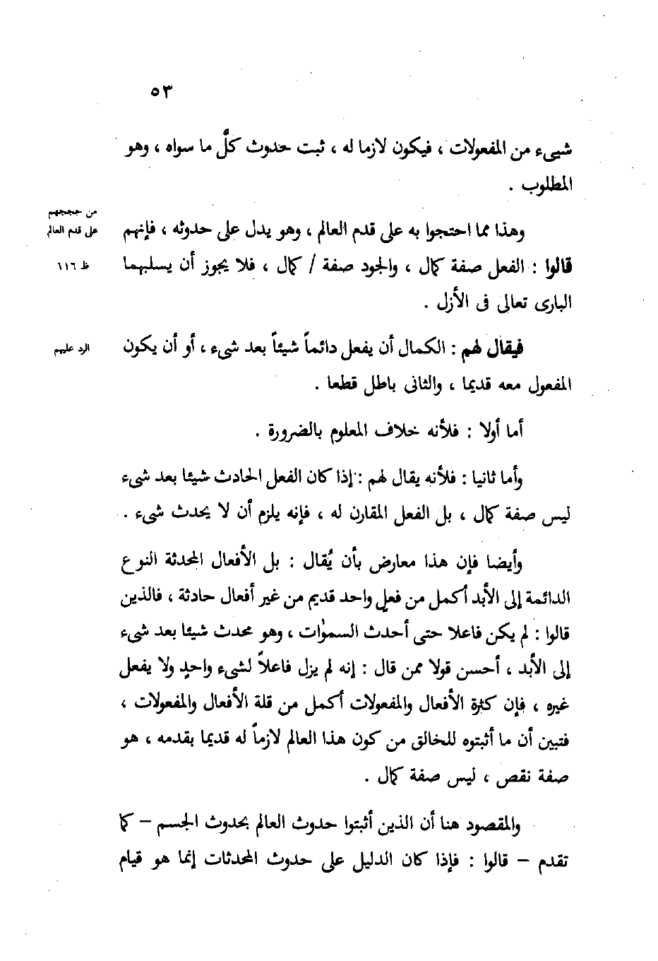 فيقال لهم: الكمال أن يفعل دائما شيئا بعد شيء أو أن يكون المفعول معه قديما والثاني باطل قطعا.