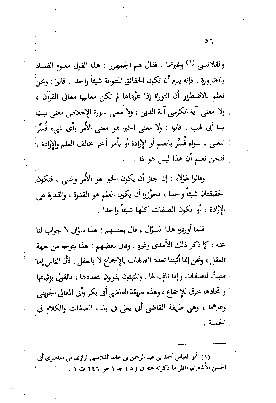 والقلانسي وغيرهما فقال لهم الجمهور هذا القول معلوم الفساد بالضرورة فإنه يلزم أن تكون الحقائق المتنوعة شيئا واحدا قالوا ونحن نعلم بالاضطرار أن التوراة إذا عربناها لم تكن معانيها معاني القرآن ولا معنى آية الكرسي آية الدين ولا معنى سورة الإخلاص معنى تبت يدا أبي لهب قالوا ولا معنى الخبر هو معنى الأمر بأي شيء فسر المعنى سواء فسر بالعلم أو الإرادة أو بأمر آخر يخالف العلم والإرادة فنحن نعلم أن هذا ليس هو ذا.