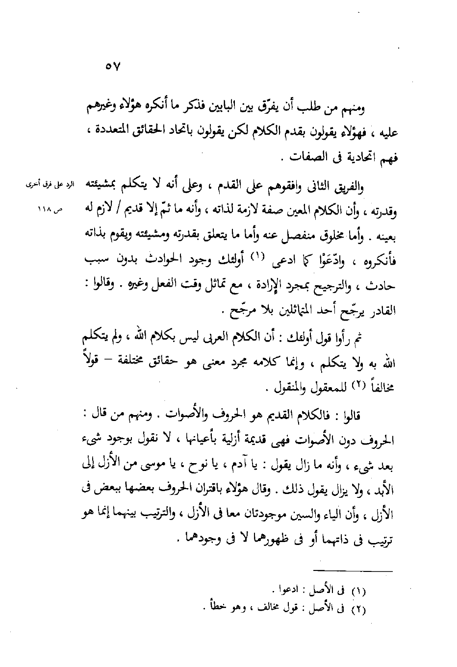 والفريق الثاني وافقوهم على القدم وعلى أنه لا يتكلم بمشيئته وقدرته وأن الكلام المعين صفة لازمة لذاته وأنه ما ثم إلا قديم لازم له بعينه وأما مخلوق منفصل عنه وأما ما يتعلق بقدرته ومشيئته ويقوم بذاته فأنكروه وادعوا كما ادعى أولئك وجود الحوادث بدون سبب حادث والترجيح بمجرد الإرادة مع تماثل وقت الفعل وغيره وقالوا القادر يرجح أحد المتماثلين بلا مرجح.