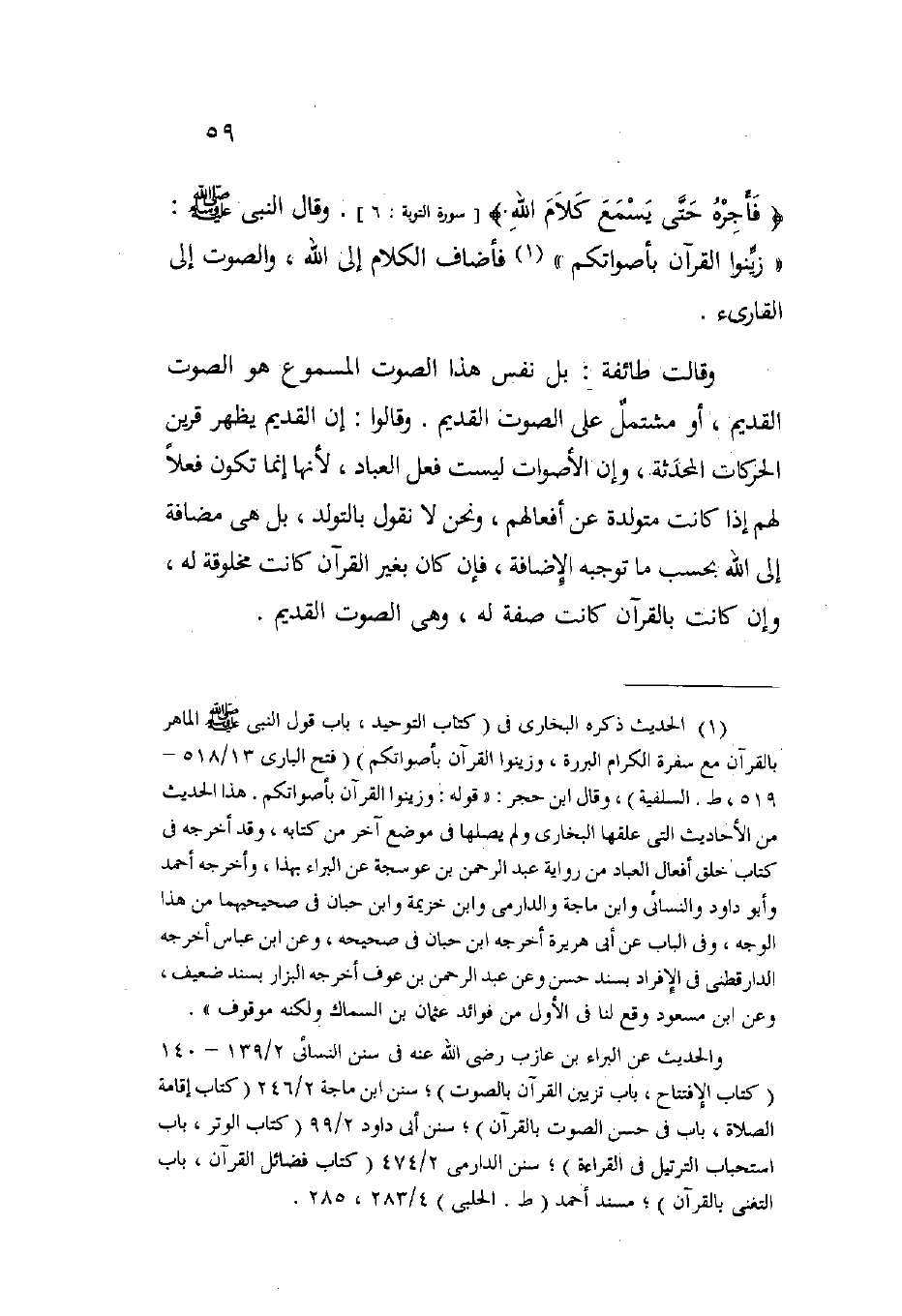 {فَأَجِرْهُ حَتَّى يَسْمَعَ كَلامَ اللَّهِ} (سورة التوبة 6) وقال النبي صَلَّى اللَّهُ عَلَيْهِ وَسَلَّمَ: "زينوا القرآن بأصواتكم" فأضاف الكلام إلى الله والصوت إلى القارىء.