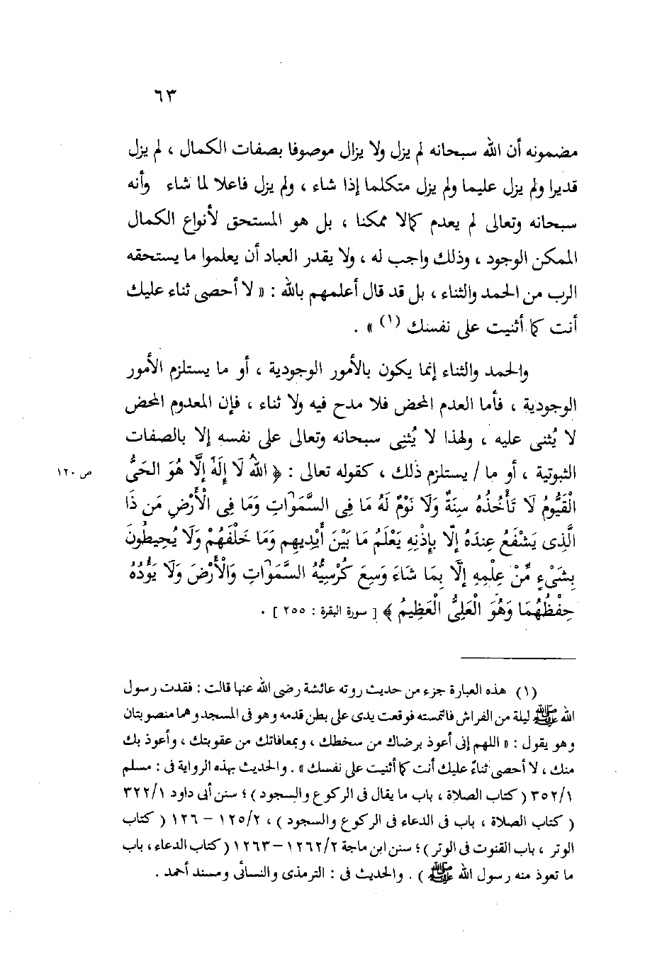 والحمد والثناء إنما يكون بالأمور الوجودية أو ما يستلزم الأمور الوجودية فأما العدم المحض فلا مدح فيه ولا ثناء فإن المعدوم المحض لا يثنى عليه ولهذا لا يثني سبحانه وتعالى على نفسه إلا بالصفات الثبوتية أو ما يستلزم ذلك كقوله تعالى: {اللَّهُ لا إِلَهَ إِلاَّ هُوَ الْحَيُّ الْقَيُّومُ لا تَأْخُذُهُ سِنَةٌ وَلا نَوْمٌ لَهُ مَا فِي السَّمَاوَاتِ وَمَا فِي الأَرْضِ مَنْ ذَا الَّذِي يَشْفَعُ عِنْدَهُ إِلاَّ بِإِذْنِهِ يَعْلَمُ مَا بَيْنَ أَيْدِيهِمْ وَمَا خَلْفَهُمْ وَلا يُحِيطُونَ بِشَيْءٍ مِنْ عِلْمِهِ إِلاَّ بِمَا شَاءَ وَسِعَ كُرْسِيُّهُ السَّمَاوَاتِ وَالأَرْضَ وَلا يَؤُودُهُ حِفْظُهُمَا وَهُوَ الْعَلِيُّ الْعَظِيمُ} (سورة البقرة 255)