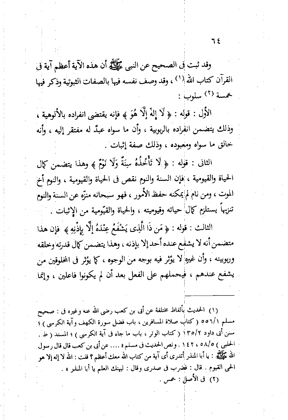 وقد ثبت في الصحيح عن النبي صَلَّى اللَّهُ عَلَيْهِ وَسَلَّمَ أن هذه الآية أعظم آية في القرآن كتاب الله وقد وصف نفسه فيها بالصفات الثبوتية وذكر فيها خمسة سلوب.