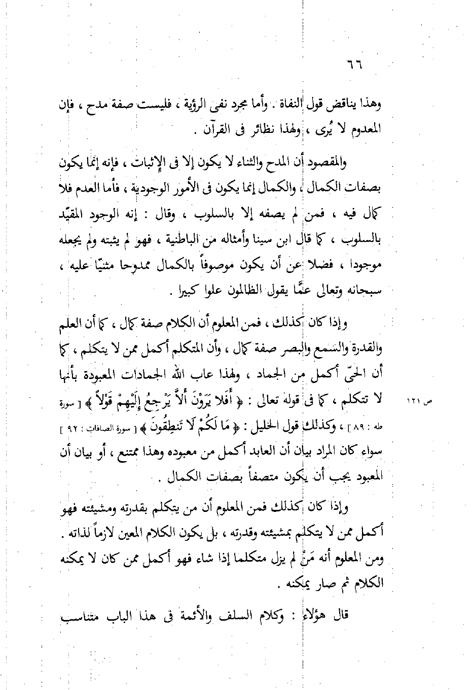 وإذا كان كذلك فمن المعلوم أن الكلام صفة كمال كما أن العلم والقدرة والسمع والبصر صفة كمال وأن المتكلم أكمل ممن لا يتكلم كما أن الحي أكمل من الجماد ولهذا عاب الله الجمادات المعبودة بأنها لا تتكلم كما في قوله تعالى: {أَفَلا يَرَوْنَ أَلاَّ يَرْجِعُ إِلَيْهِمْ قَوْلاً} (سورة طه 89) وكذلك قول الخليل: {مَا لَكُمْ لا تَنْطِقُونَ} (سورة الصافات 92) سواء كان المراد بيان أن العابد أكمل من معبوده وهذا ممتنع أو بيان أن المعبود يجب أن يكون متصفا بصفات الكمال.
