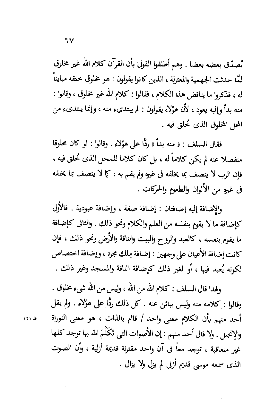 ولهذا قال السلف: "كلام الله من الله وليس من الله شيء مخلوق" وقالوا: "كلامه منه وليس ببائن عنه" كل ذلك ردا على هؤلاء ولم يقل أحد منهم بأن الكلام معنى واحد قائم بالذات هو معنى التوراة والإنجيل ولا قال أحد منهم إن الأصوات التي تكلم الله بها توجد كلها غير متعاقبة توجد معا في آن واحد مقترنة قديمة أزلية وأن الصوت الذي سمعه موسى قديم أزلي لم يزل ولا يزال.