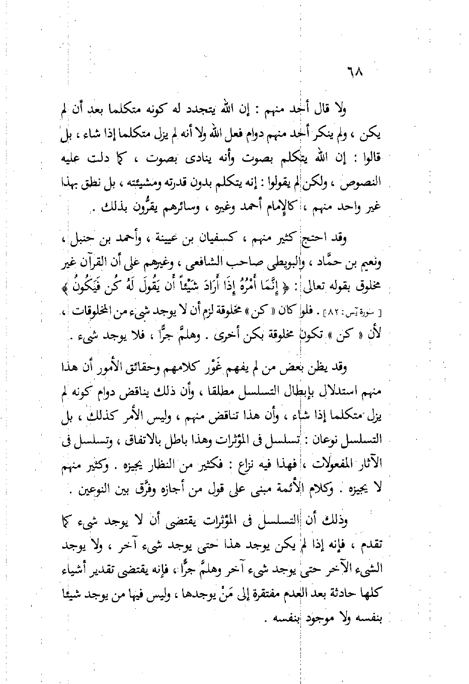 وقد احتج كثير منهم كسفيان بن عيينة وأحمد بن حنبل ونعيم بن حماد والبويطي صاحب الشافعي وغيرهم على أن القرآن غير مخلوق بقوله تعالى: {إِنَّمَا أَمْرُهُ إِذَا أَرَادَ شَيْئاً أَنْ يَقُولَ لَهُ كُنْ فَيَكُونُ} (سورة يس 82) فلو كان كن مخلوقة لزم أن لا يوجد شيء من المخلوقات لأن كن تكون مخلوقة بكن أخرى وهلم جرا فلا يوجد شيء.
