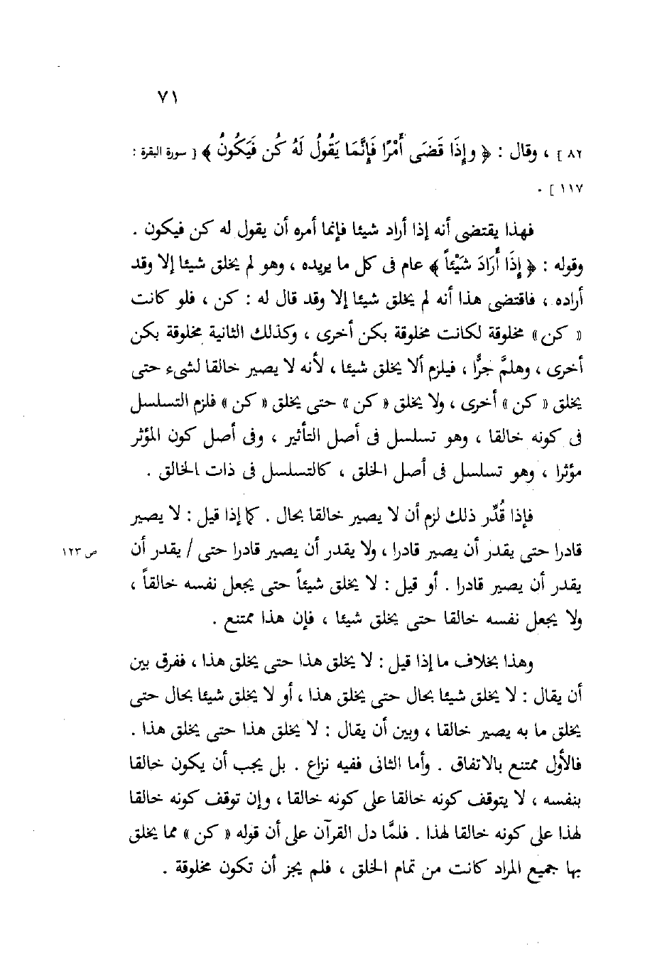 فهذا يقتضي أنه إذا أراد شيئا فإنما أمره أن يقول له كن فيكون وقوله: {إِذَا أَرَادَ شَيْئاً} عام في ما يريده وهو لم يخلق شيئا إلا وقد أراده فاقتضى هذا انه لم يخلق شيئا إلا وقد قال له كن فلو كانت كن مخلوقة لكانت مخلوقة بكن أخرى وكذلك الثانية مخلوقة بكن أخرى وهلم جرا فيلزم ألا يخلق شيئا لأنه لا يصير خالقا لشيء حتى يخلق كن أخرى ولا يخلق كن حتى يخلق كن فلزم التسلسل في كونه خالقا وهو تسلسل في أصل التأثير وفي أصل كون المؤثر مؤثرا وهو تسلسل في أصل الخلق كالتسلسل في ذات الخالق.