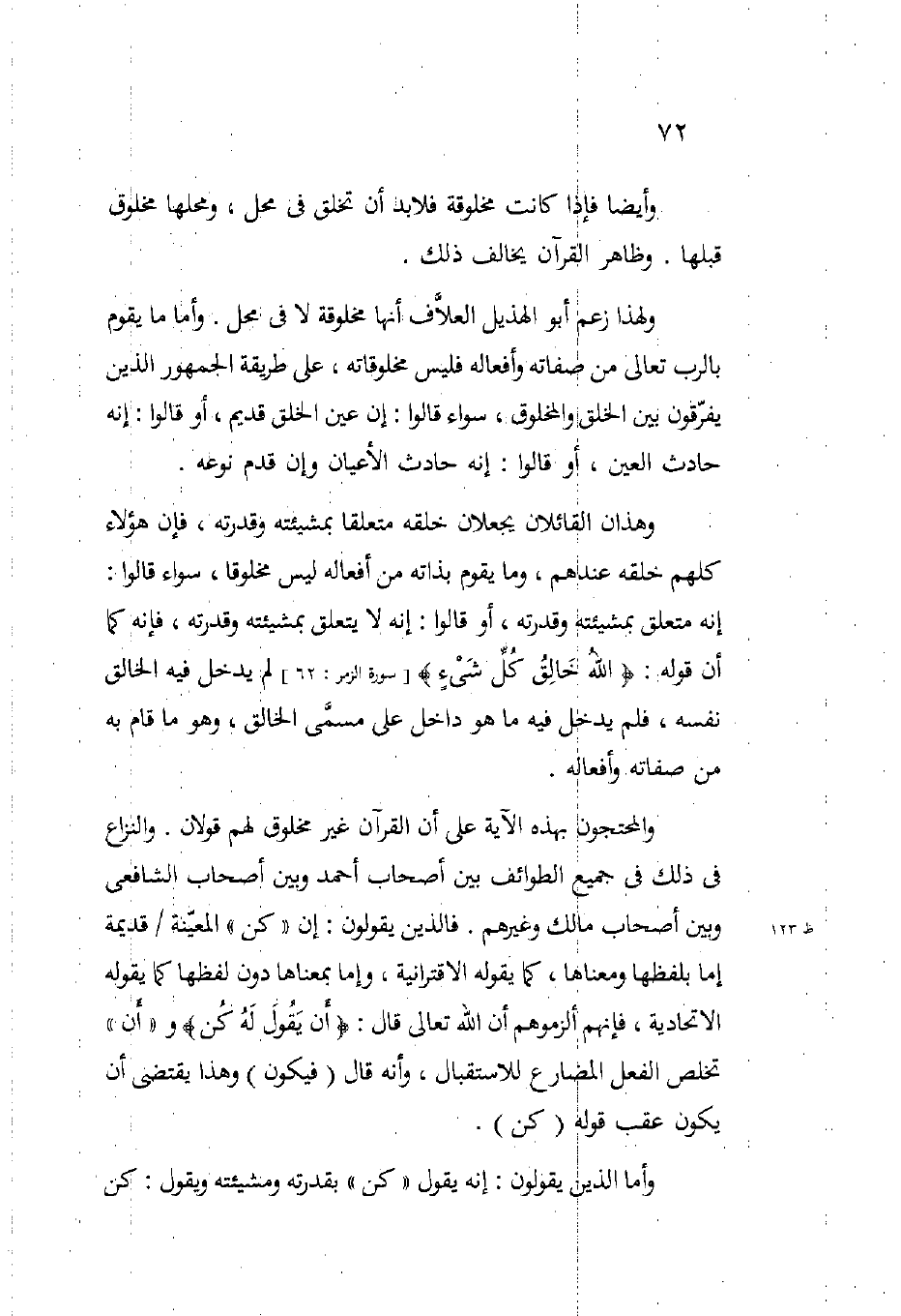 وأيضا فإذا كانت مخلوقة فلا بد أن تخلق في محل ومحلها مخلوق قبلها وظاهر القرآن يخالف.
