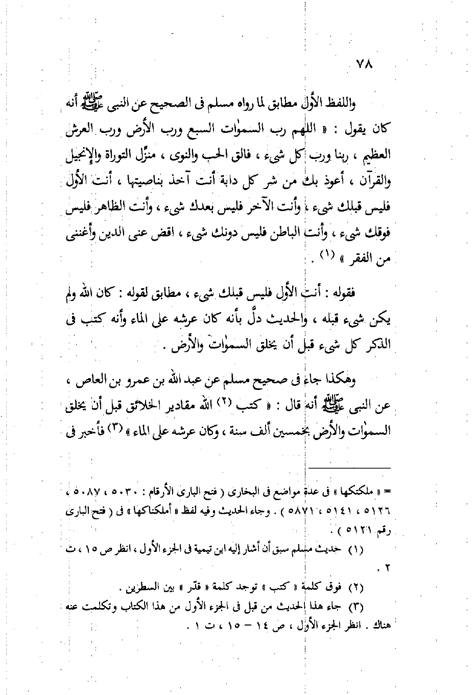 واللفظ الأول مطابق لما رواه مسلم في الصحيح عن النبي صَلَّى اللَّهُ عَلَيْهِ وَسَلَّمَ أنه كان يقول: "اللهم رب السموات السبع ورب الأرض ورب العرش العظيم ربنا ورب كل شيء فالق الحب والنوى منزل التوارة والإنجيل والقرآن أعوذ بك من شر كل دابة أنت آخذ بناصيتها أنت الأول فليس قبلك شيء وأنت الآخر فليس بعدك شيء وأنت الظاهر فليس فوقك شيء وأنت الباطن فليس دونك شيء اقض عني الدين وأغنني من الفقر".