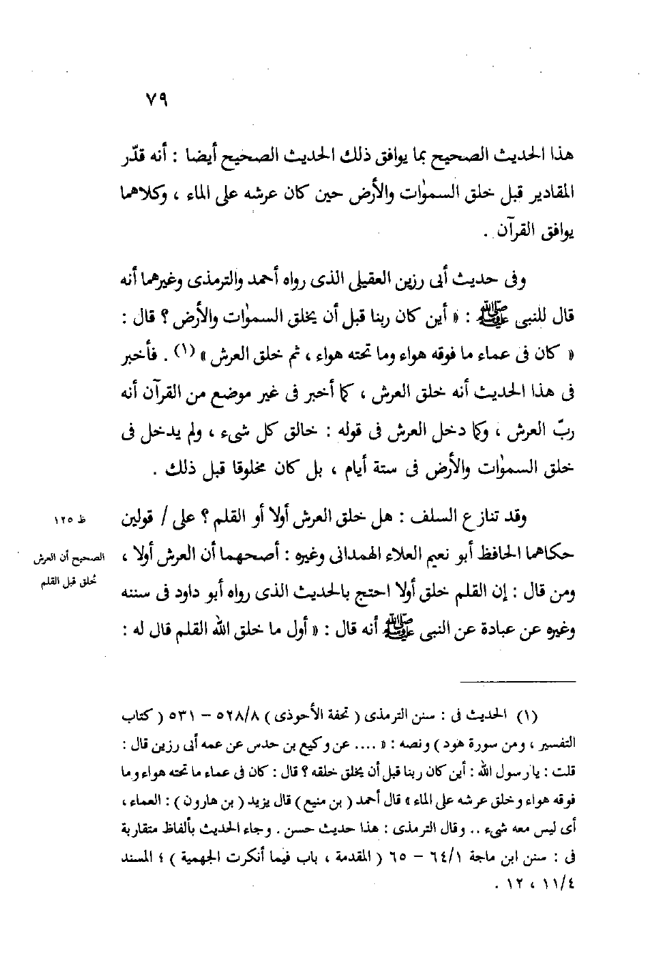 وقد تنازع السلف هل خلق العرش أولا أو القلم؟ على قولين حكاهما الحافظ أبو نعيم العلاء الهمداني وغيره أصحهما أن العرش أولا ومن قال إن القلم خلق أولا احتج بالحديث الذي رواه أبو داود في سننه وغيره عن عبادة عن النبي صَلَّى اللَّهُ عَلَيْهِ وَسَلَّمَ أنه قال: "أول ما خلق الله القلم قال له: