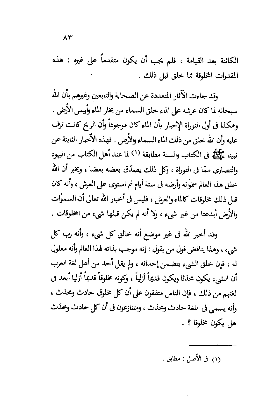 وقد جاءت الآثار المتعددة عن الصحابة والتابعين وغيرهم بأن الله سبحانه لما كان عرشه على الماء خلق السماء من بخار الماء وأيبس الأرض وهكذا في أول التوراة الإخبار بأن الماء كان موجودا وأن الريح كانت ترف عليه وأن الله خلق من ذلك الماء السماء والأرض فهذه الأخبار الثابتة عن نبينا صَلَّى اللَّهُ عَلَيْهِ وَسَلَّمَ في الكتاب والسنة مطابقة لما عند أهل الكتاب من اليهود والنصارى مما في التوراة وكل ذلك يصدق بعضه بعضا ويخبر أن الله خلق هذا العالم سمواته وأرضه في ستة أيام ثم استوى على العرش وأنه كان قبل ذلك مخلوقات كالماء والعرش فليس في إخبار الله تعالى أن السموات والأرض أبدعتا من غير شيء ولا أنه لم يكن قبلها شيء من المخلوقات.