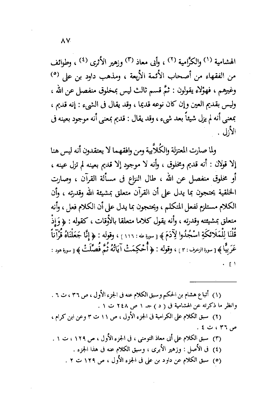 الهشامية والكرامية وأبي معاذ وزهير الأثري وطوائف من الفقهاء من أصحاب الأئمة الأربعة ومذهب داود بن علي وغيرهم فهؤلاء يقولون ثم قسم ثالث ليس بمخلوق منفصل عن الله وليس بقديم العين وإن كان نوعه قديما وقد يقال في الشيء إنه قديم بمعنى أنه لم يزل شيئا بعد شيء وقد يقال قديم بمعنى أنه موجود بعينه في الأزل.