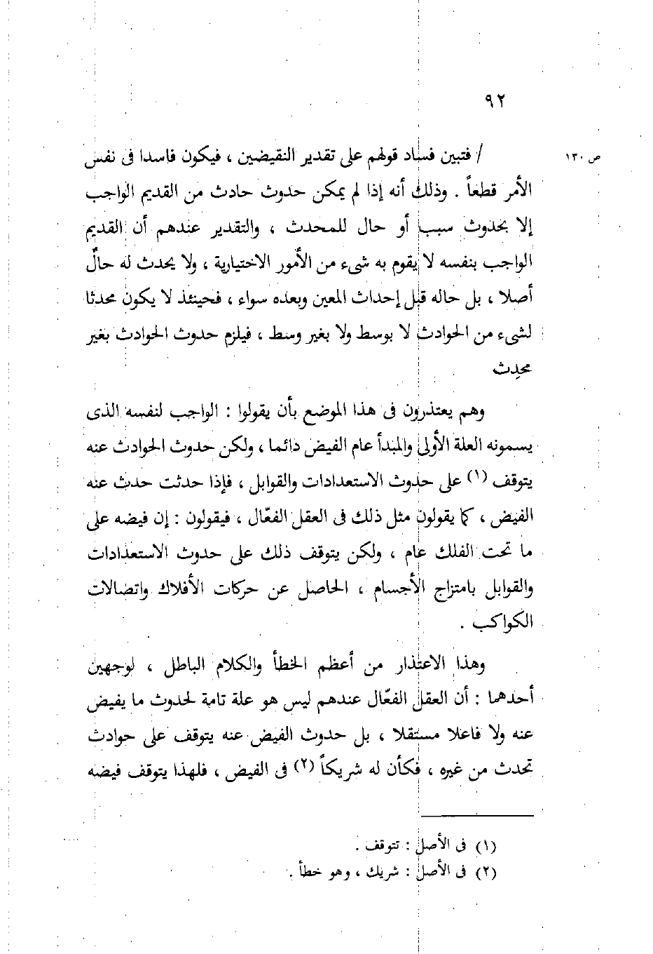 وهم يعتذرون في هذا الموضع بأن يقولوا الواجب لنفسه الذي يسمونه العلة الأولى والمبدأ عام الفيض دائما ولكن حدوث الحوادث عنه يتوقف على حدوث الاستعدادات والقوابل فإذا حدثت حدث عنه الفيض كما يقولون مثل ذلك في العقل الفعال فيقولون إن فيضه على ما تحت الفلك عام ولكن يتوقف ذلك على حدوث الاستعدادات والقوابل بامتزاج الأجسام الحاصل عن حركات الأفلاك واتصالات الكواكب.
